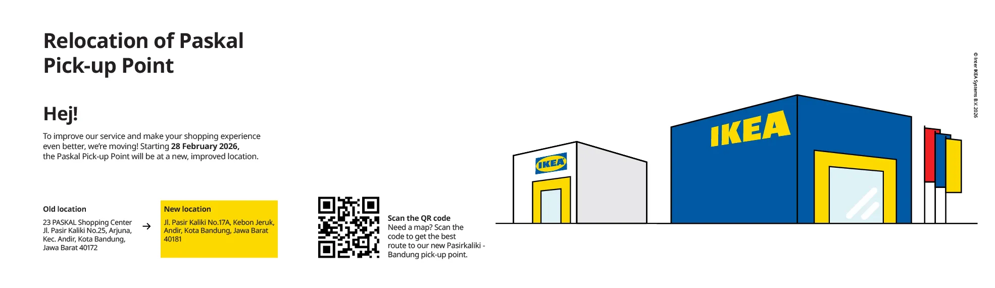 Bandung, 23 February 2026 – IKEA Indonesia announces the relocation of its Pasir Kaliki Pick-up Point (PUP), effective 28 February 2026. This move is part of IKEA’s ongoing efforts to enhance service quality and provide a better shopping experience for customers in Bandung.