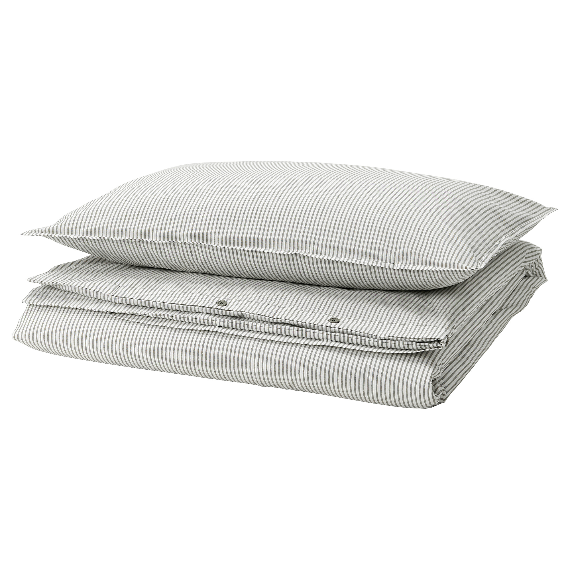 SOLFIBBLA duvet cover set is made from soft 100% cotton with clear, timeless grey and white yarn-dyed stripes. The thicker yarn adds a cosy, handcrafted vibe with a hint of vintage charm to your bedroom.