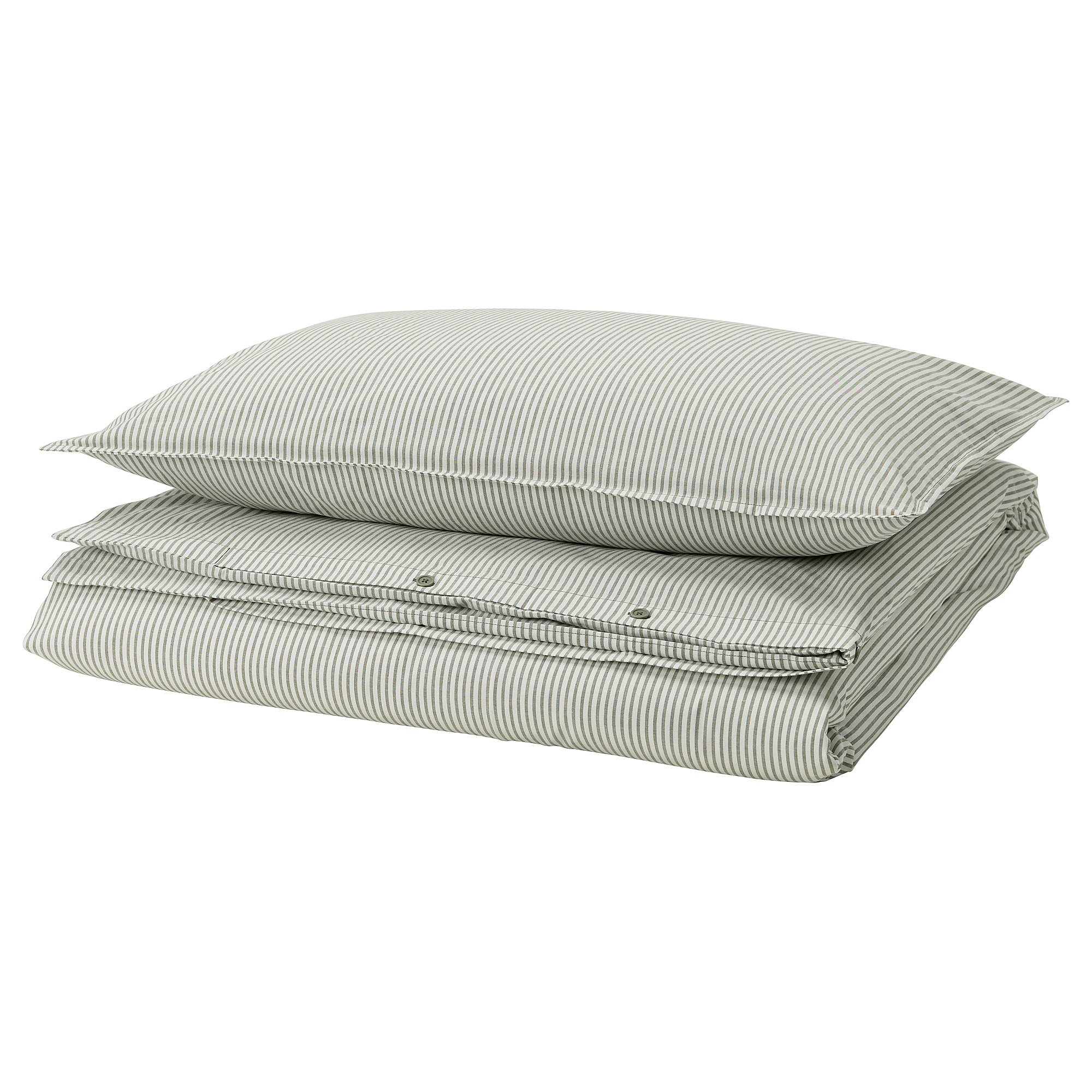 SOLFIBBLA duvet cover set is made from soft 100% cotton with clear, timeless green and white yarn-dyed stripes. The thicker yarn adds a cosy, handcrafted vibe with a hint of vintage charm to your bedroom.