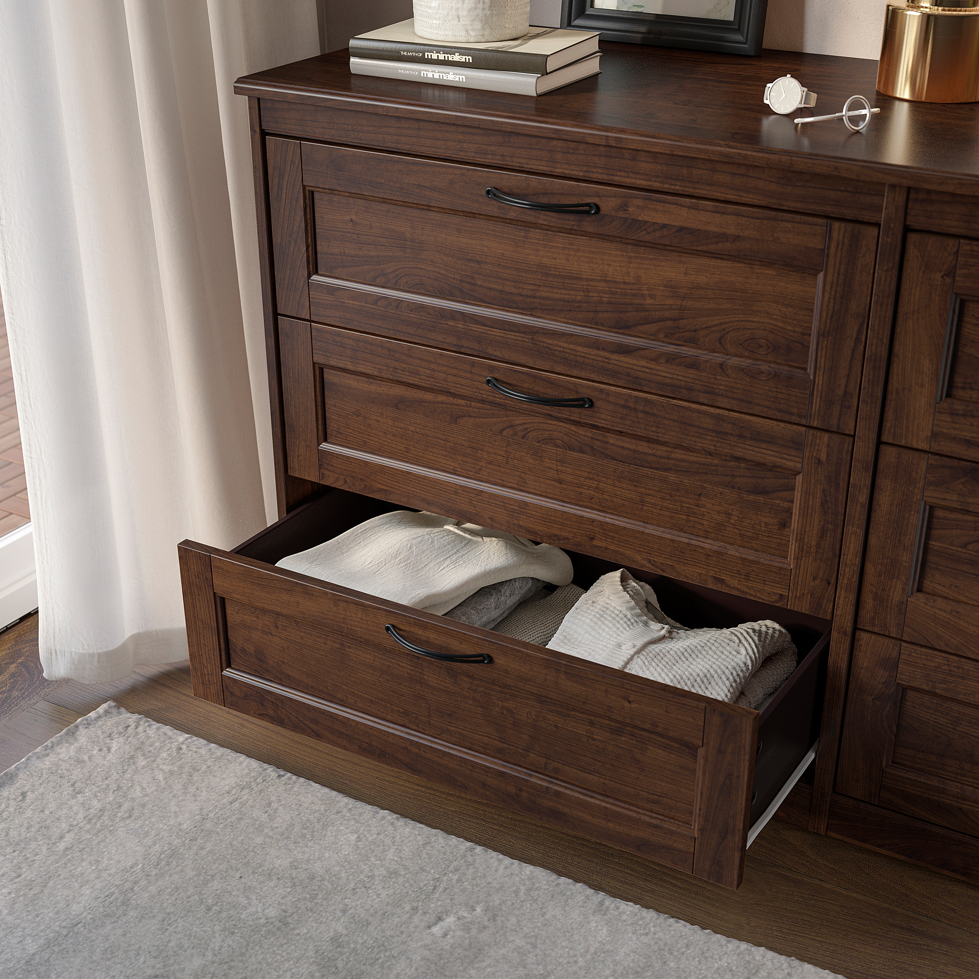 The drawer holds about 15 pairs of folded trousers or 30 T-shirts.