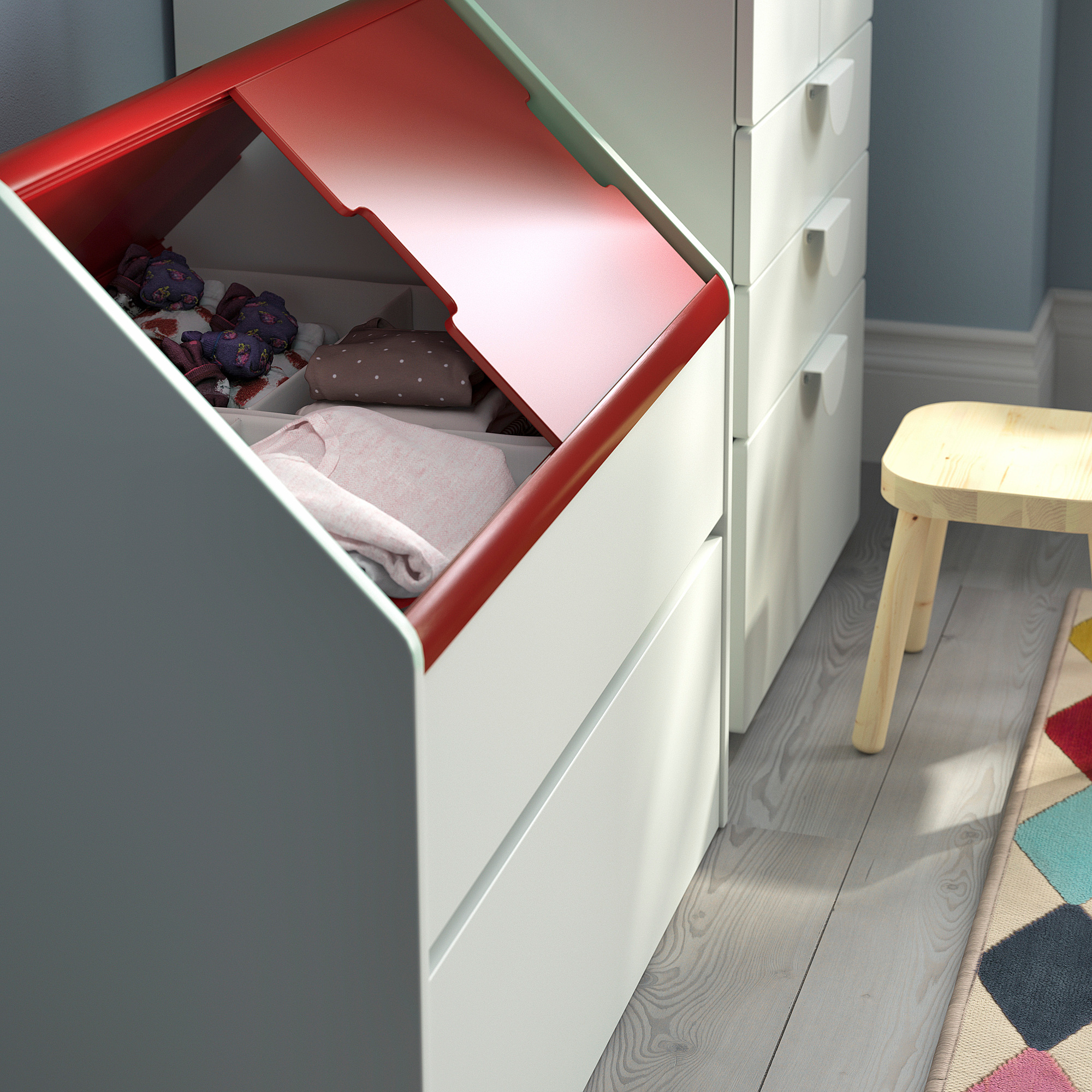 In this freestanding house, your child can have clothes in the roof and toys in the bottom. And the large drawer can be pulled out and rolled around, making it easy to gather everything after playtime.