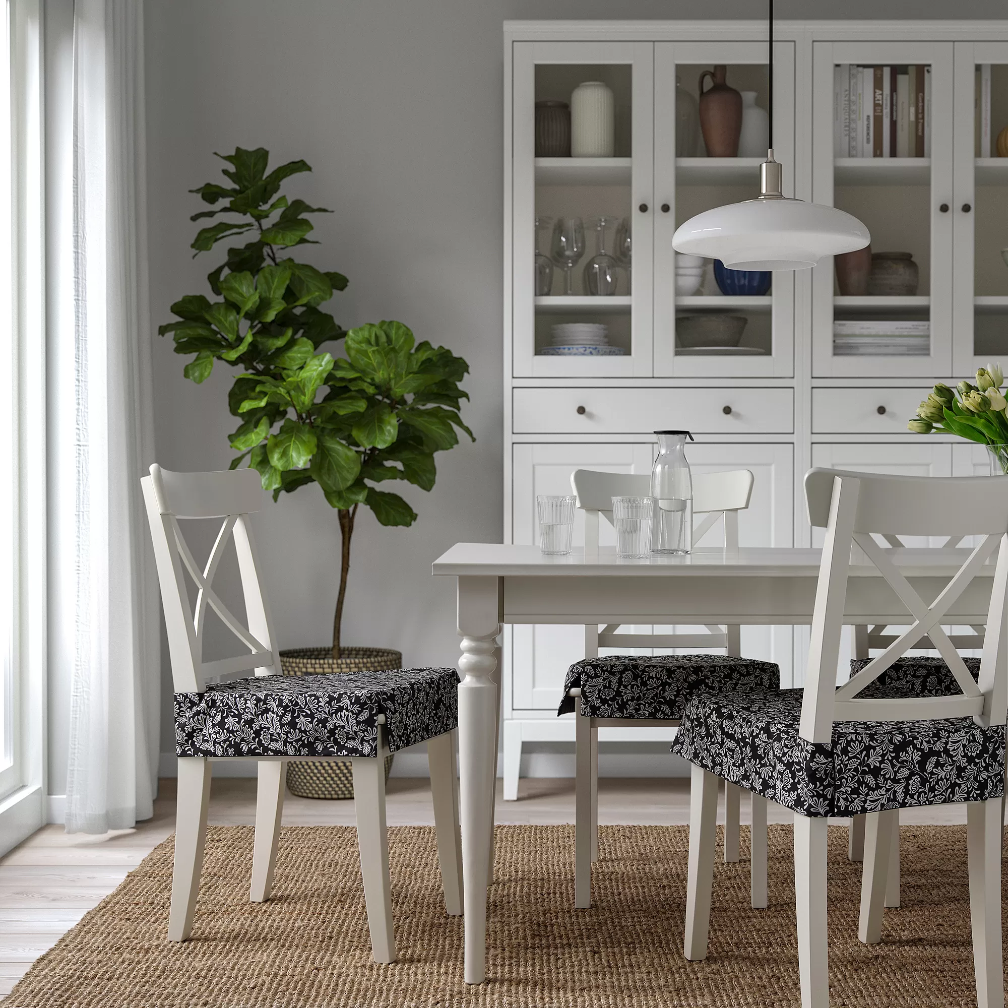 Comfy chair pad in grey/white with a 4-sided skirt for a dressed-up look. Solid colour on one side and floral pattern on the other so you can flip the cushion to change the look as you like.