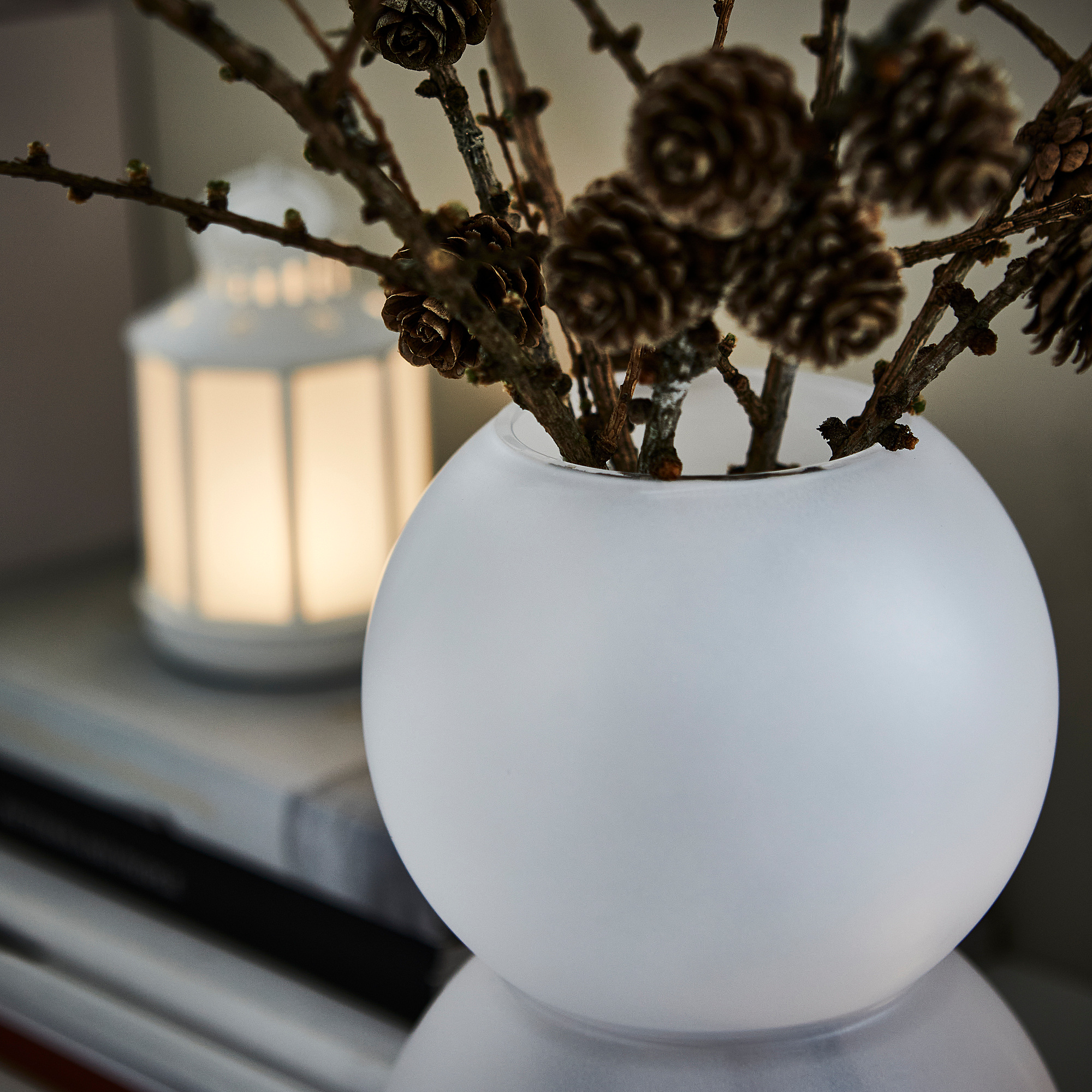 This white, snowball-inspired vase in frosted glass brings to mind a cold winter landscape – a beautiful contrast to the warm, cosy feelings indoors. Available in two different heights.