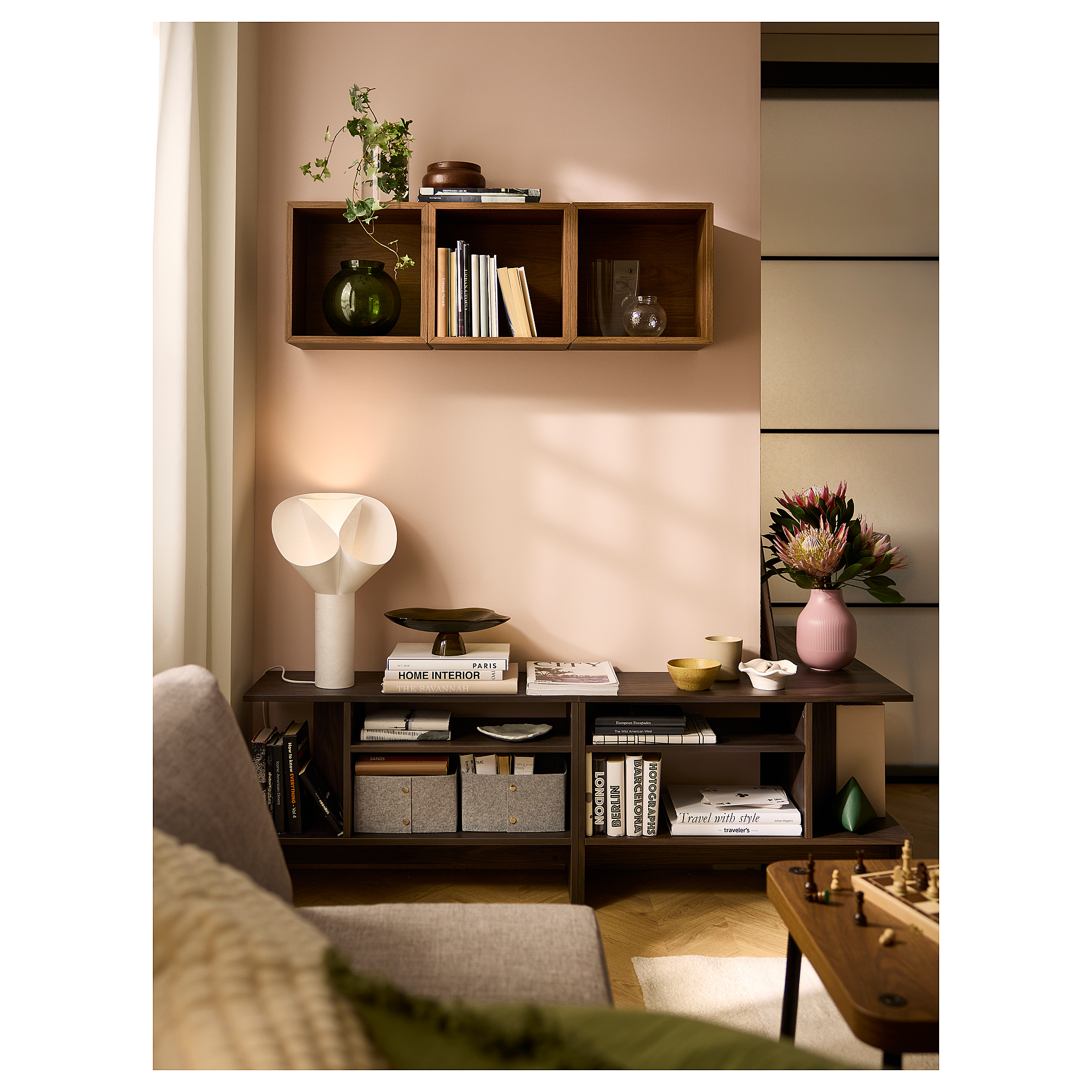 HOLMERUD side table has a distinctive architectural shape and practical storage spaces. It’s designed to stand snug along the length of your sofa’s armrest – but looks just as great against a wall!