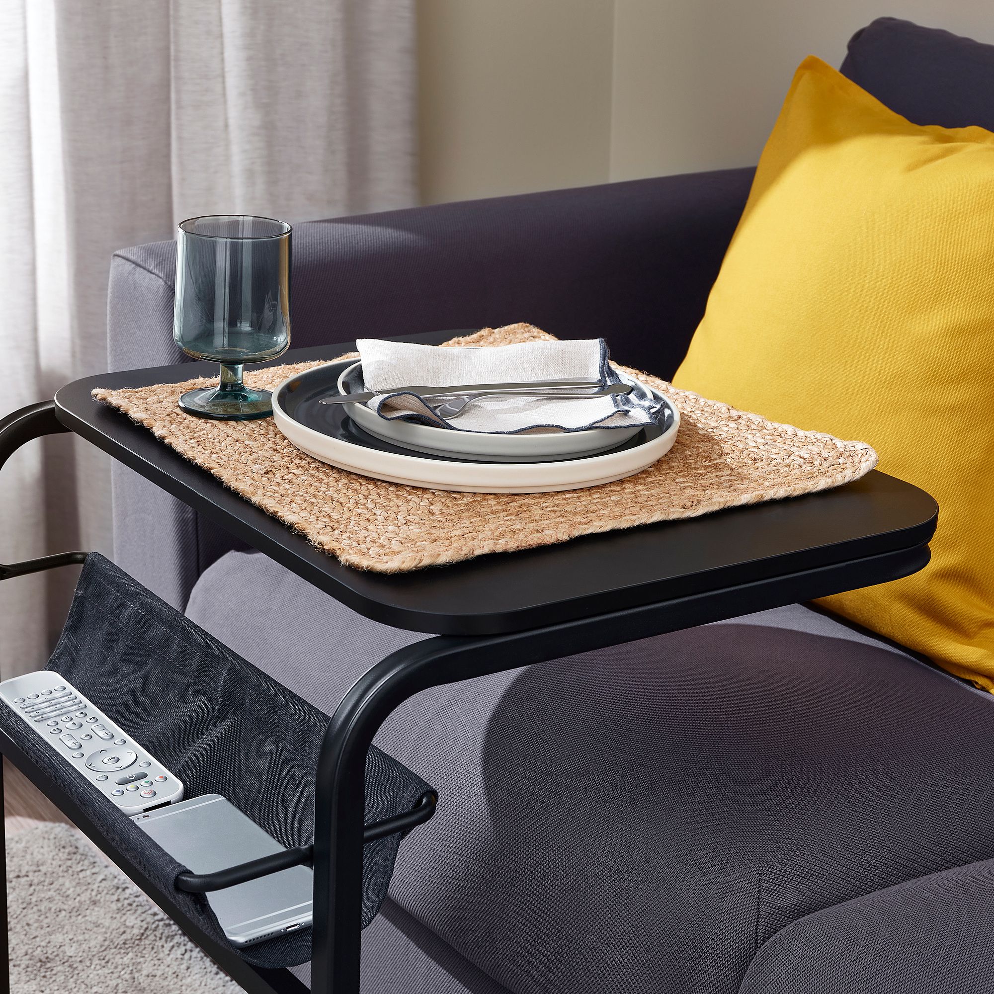 The fabric pouch under the table top is a smart storage space for small items you want close at hand. The pouch is fixed to the underframe with touch-and-close fastening so it’s easy to remove and wash.