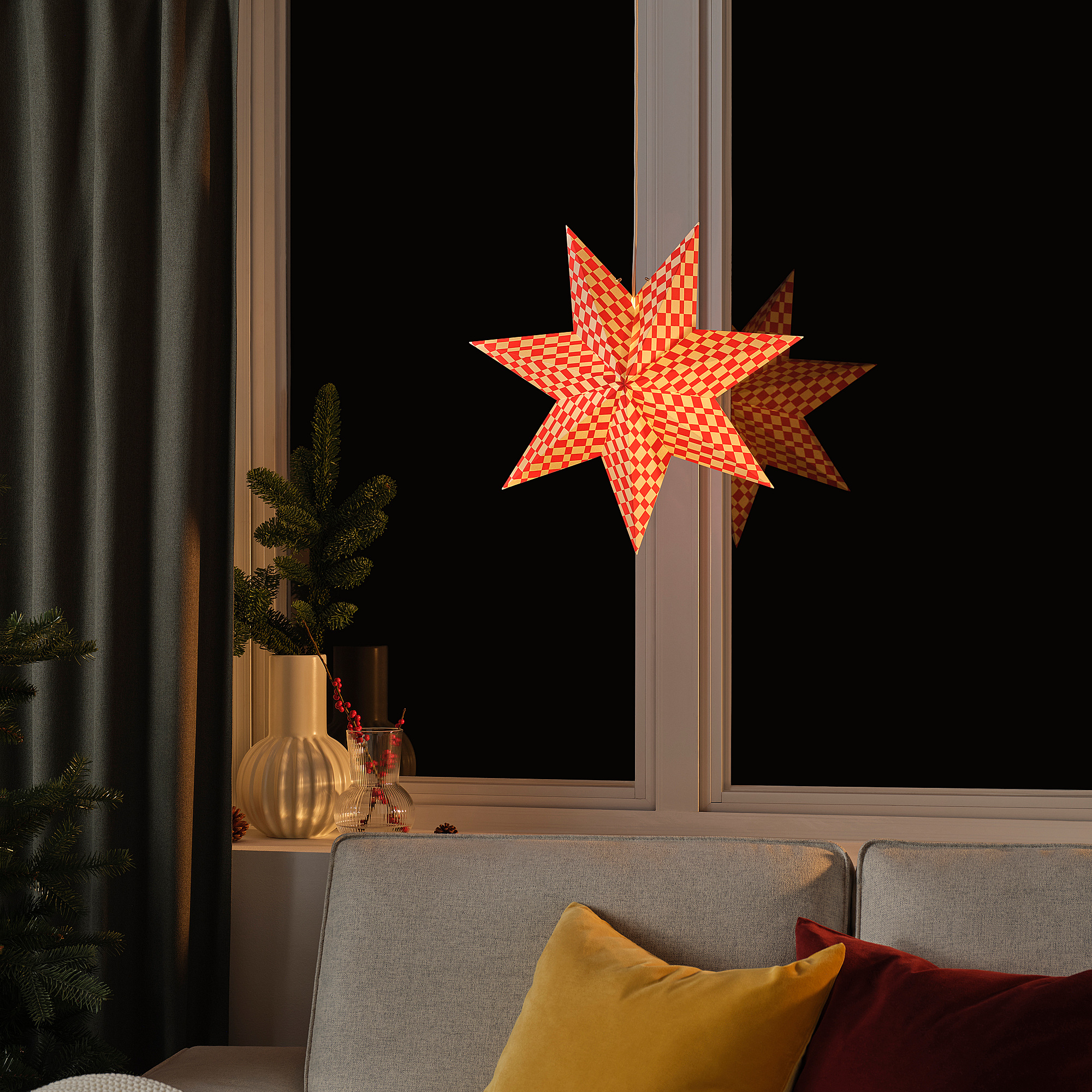 A star in the window spreads a cosy and welcoming feeling. Combine this modern checkered lampshade in red and white with a bulb and a cord set or lamp base – and let the mood set in!