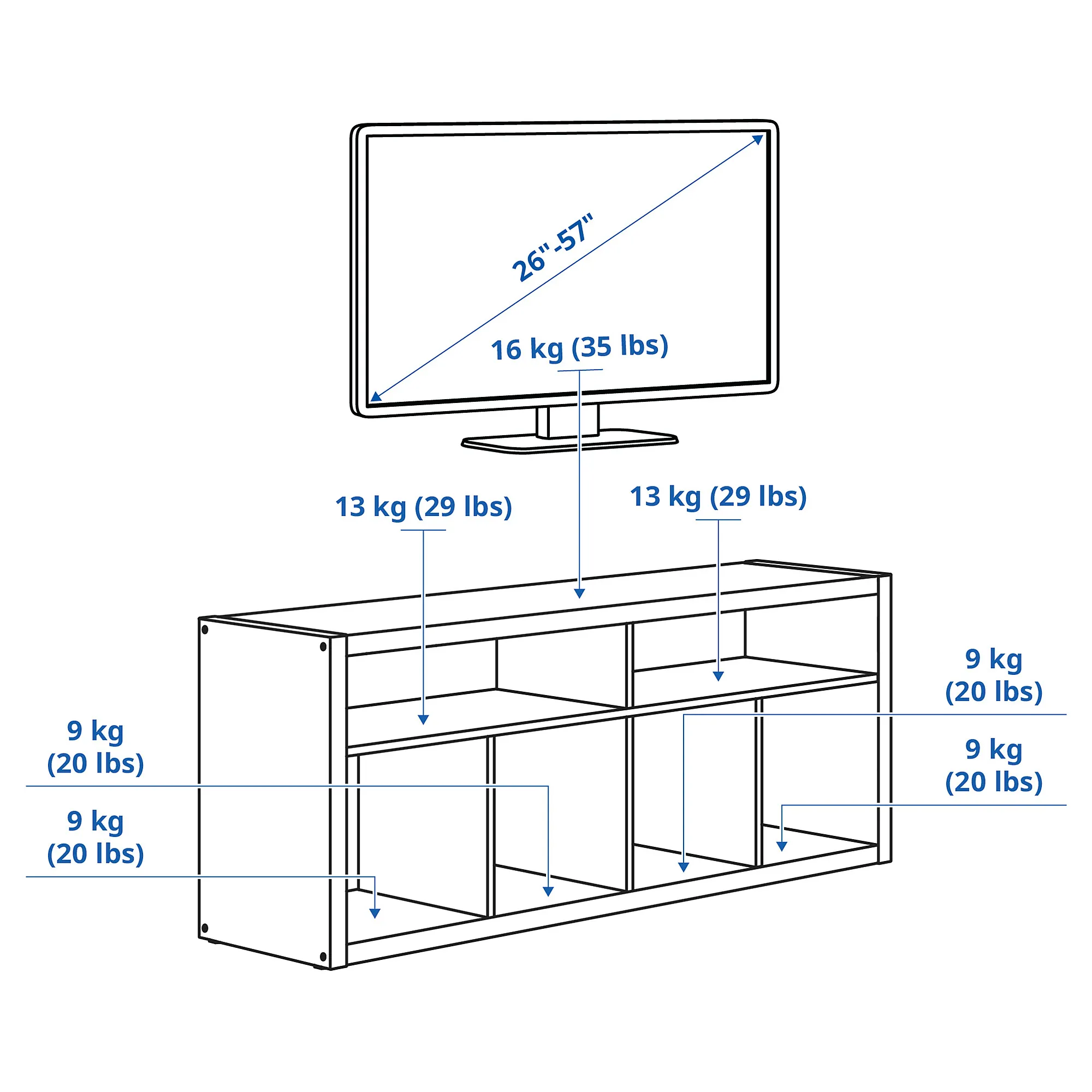 The top panel of the TV bench is intended for a TV with a maximum weight of 16 kg.