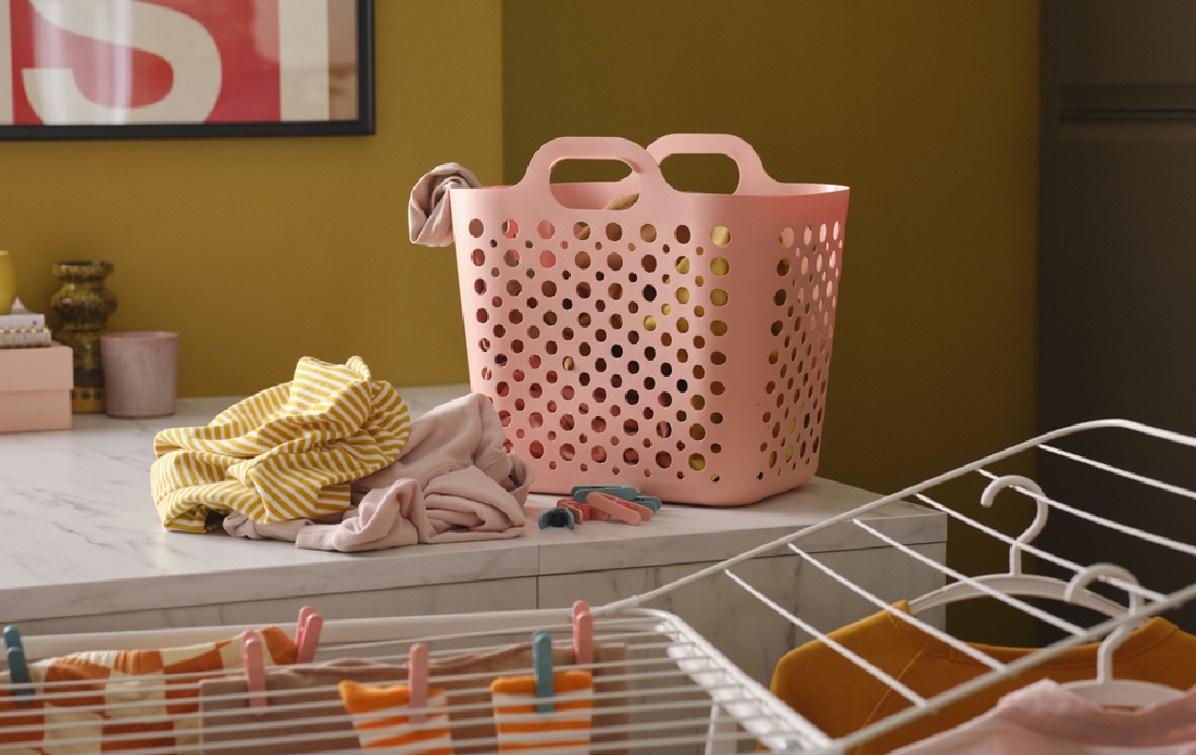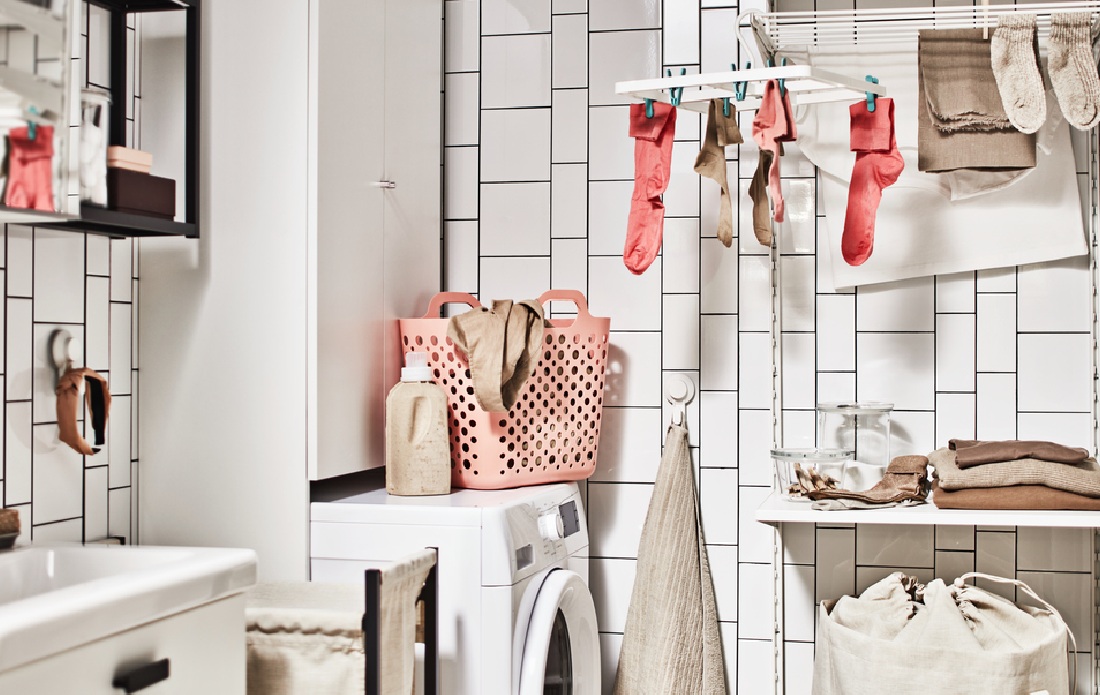 Peralatan laundry IKEA hadir bersama juga dengan keranjang berbahan plastik yang berlubang.