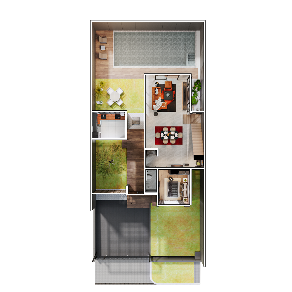 Rumah ini dirancang agar cocok untuk setiap anggota keluarga. Nuansa yang lebih gelap memberi kesan elegan sementara warna merah dan biru yang lebih gelap membuat ruang terlihat modern dan menarik. Perpaduan material seperti kaca, kain, dan kayu membuatnya tampil beda dan berani.