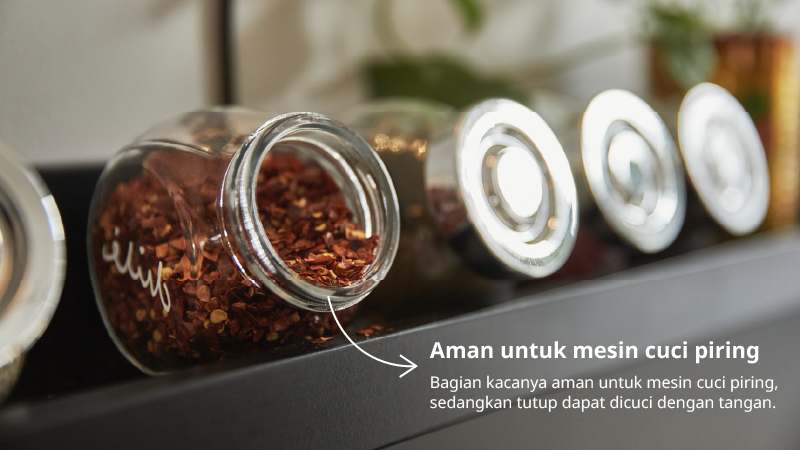 Terbuat dari kaca bening, Anda dapat melihat apa yang ada di dalam toples serta tahu kapan waktunya mengisi ulang. Sempurna diletakkan di rak atau di dalam laci dekat kompor.