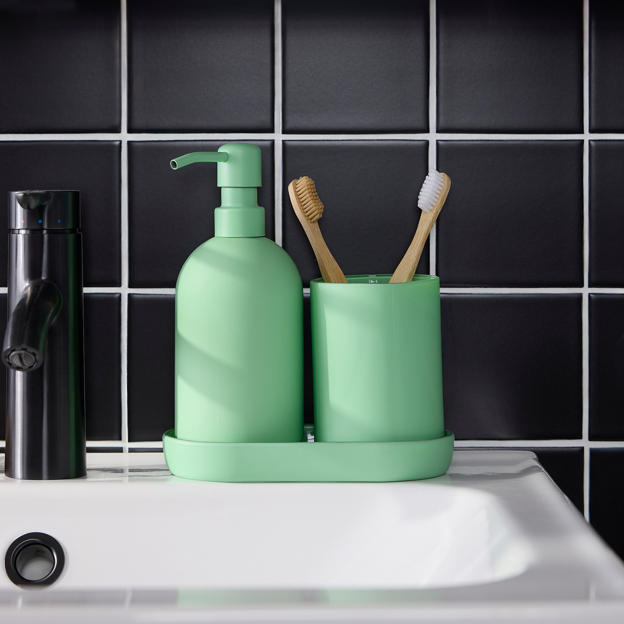 Kaca hijau muda menambah warna cerah pada kamar mandi Anda. Baki ini menyimpan tempat sikat gigi dan dispenser sabun di tempatnya, tetapi juga dapat digunakan secara terpisah untuk perhiasan, lilin, atau aksesori kecil.