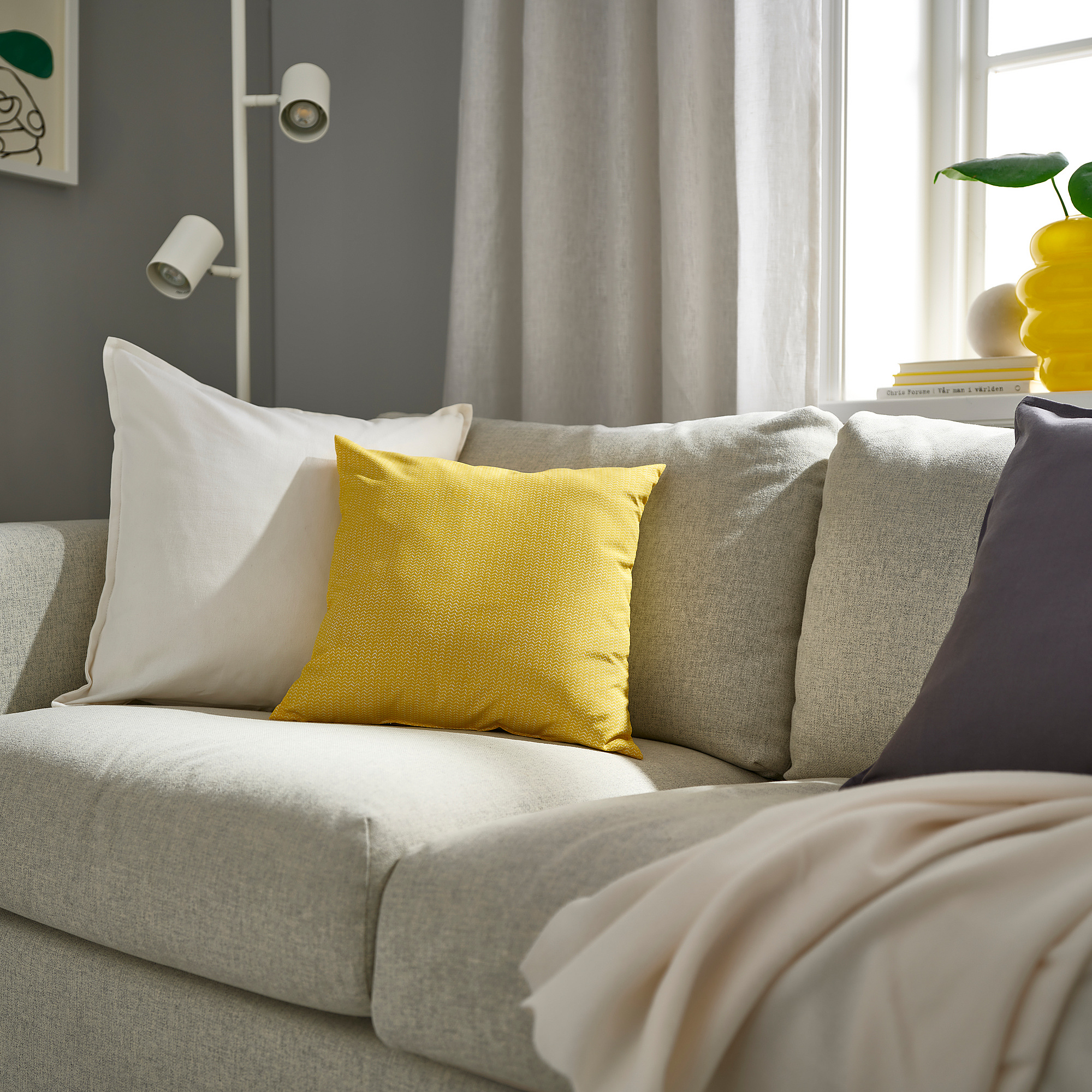 Bantal PROFETBLOMMA berwarna kuning dengan pola yang halus dan kilau yang lembut menambah gaya dan kenyamanan pada sofa Anda. Sangat cocok dipasangkan dengan sarung bantal GURLI dan bantal HOLMVI. 100% poliester daur ulang.