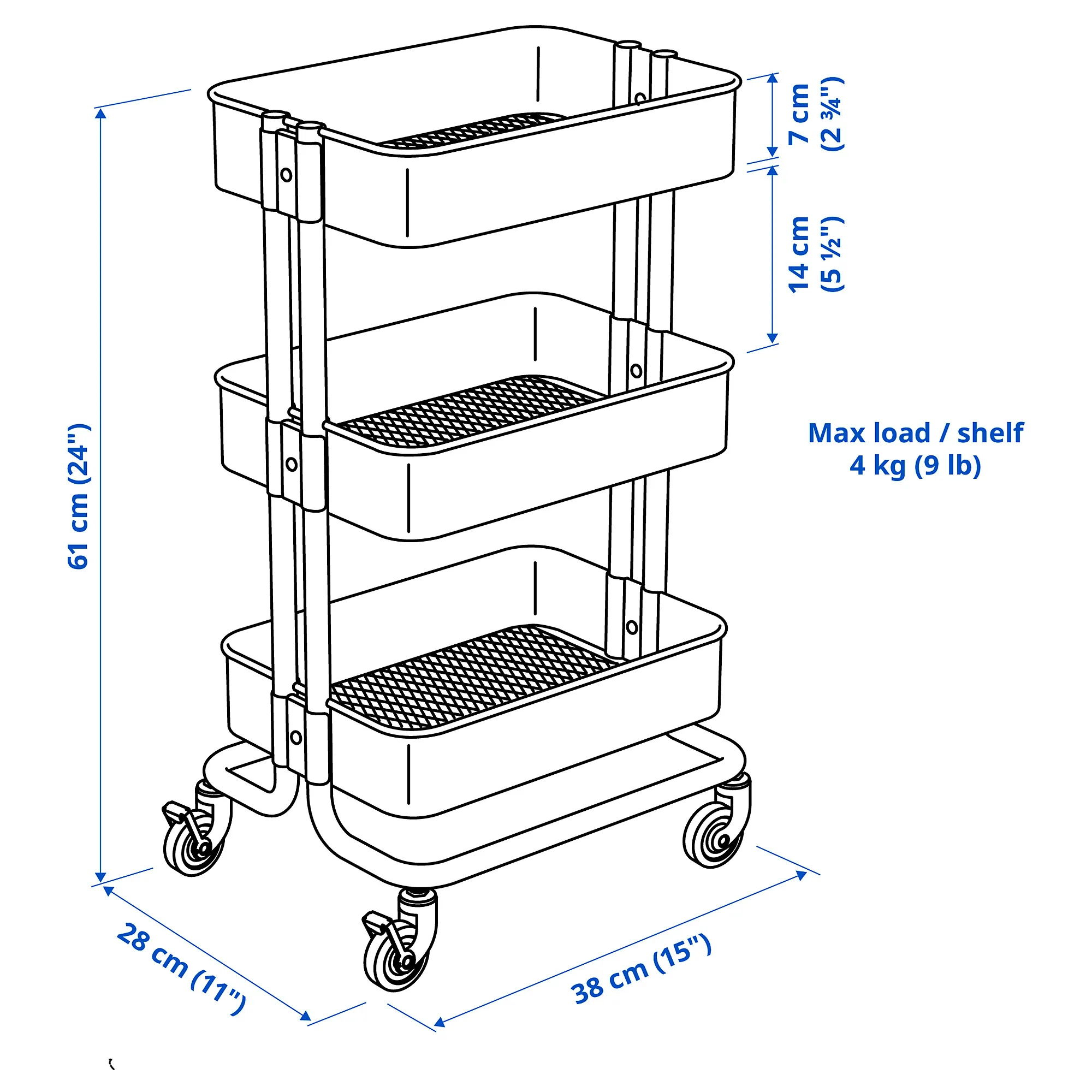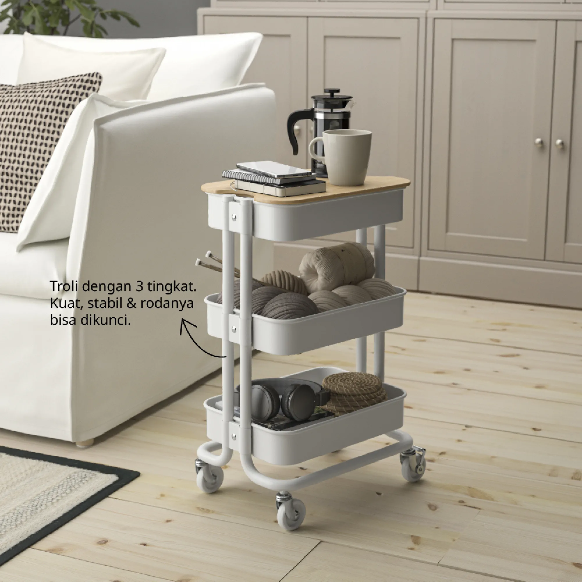 Troli RÅSKOG tersedia dalam 2 ukuran. Ukuran yang lebih kecil ini muat di bawah sebagian besar meja dan meja kerja sehingga menghemat ruang lantai.