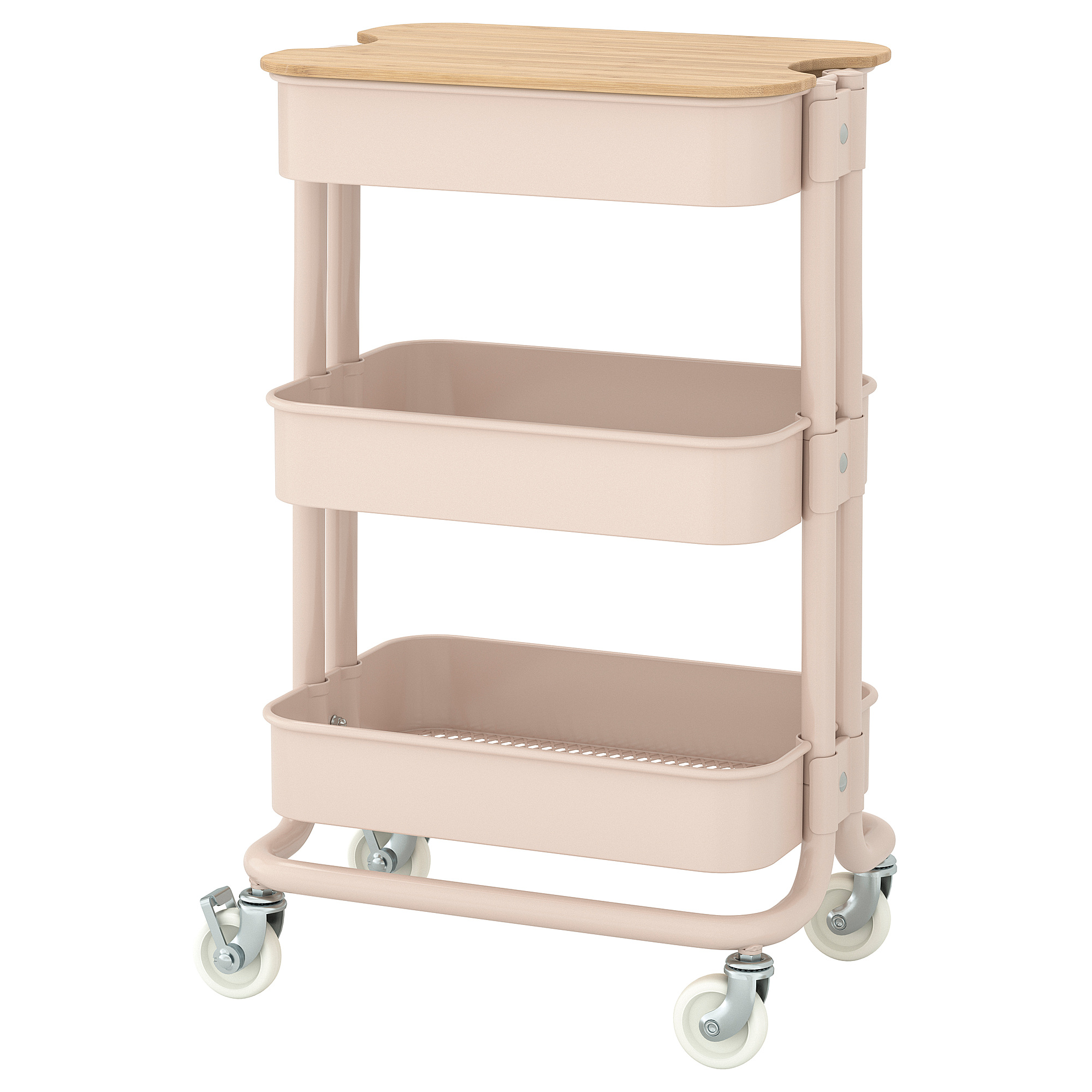 Troli ini dapat ditempatkan di ruang yang paling sempit dan dapat dipindahkan ke mana pun Anda membutuhkan ruang penyimpanan tambahan untuk peralatan rumah. Gunakan tutup bambu ini untuk meletakkan cangkir Anda atau sebagai alas kerja yang praktis.