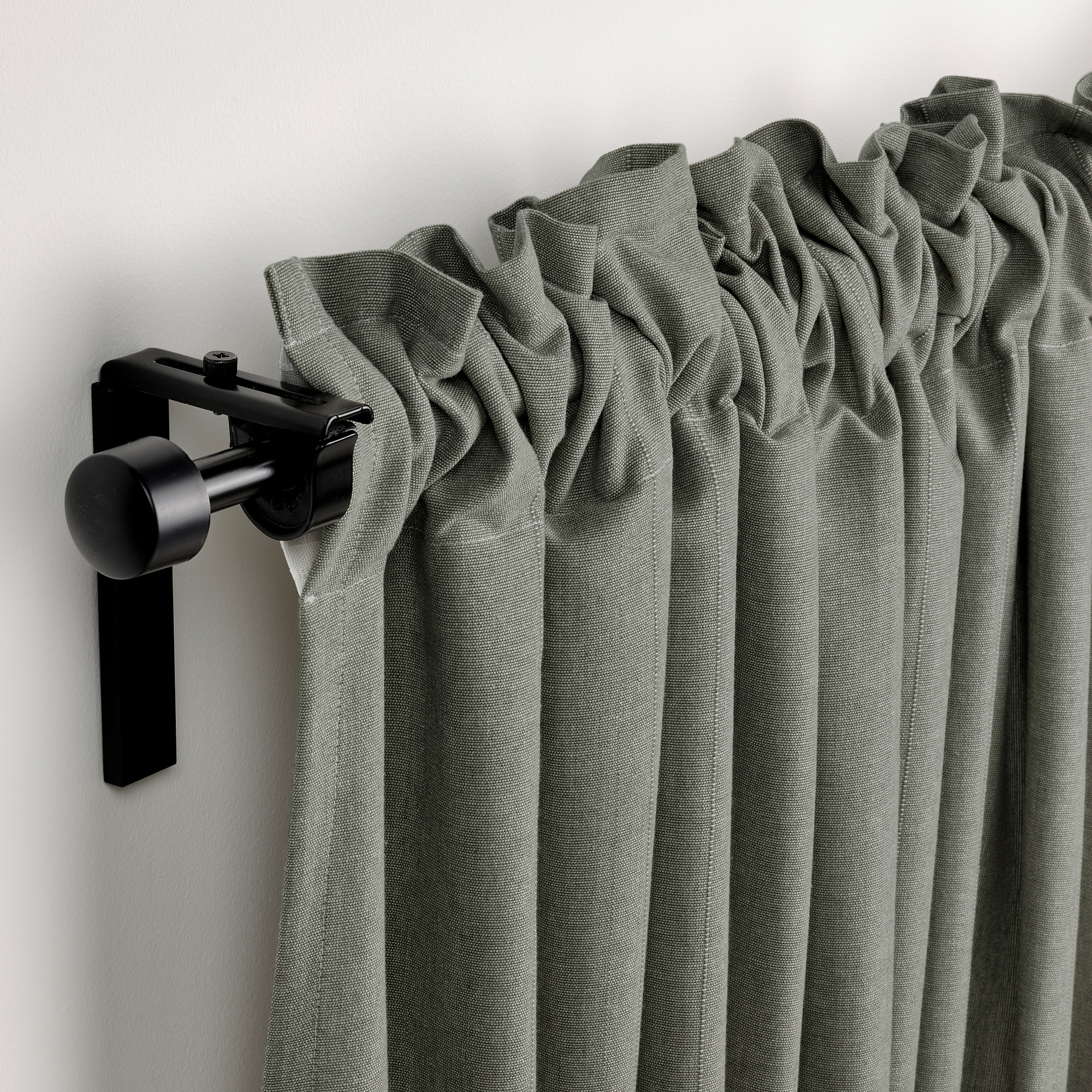 Gorden LENDA berwarna abu-abu hijau dengan header tape memiliki tenunan linier yang menambah karakter dan memberi kesan jendela lebih tinggi. Tali gorden membawa sentuhan dekoratif, menampilkan pemandangan luar.