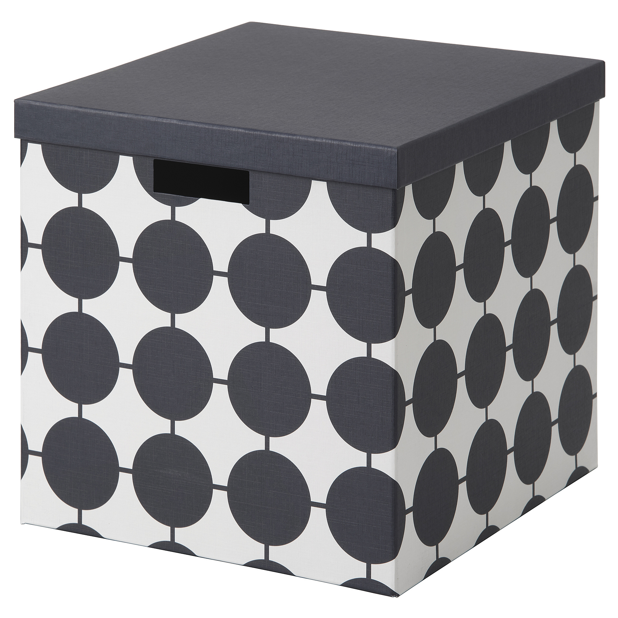 Kotak ini sangat ideal untuk barang-barang media atau hobi dan sangat cocok dengan unit rak KALLAX. Pola grafis ini dibuat oleh Ingela Håkansson-Lamm, seorang desainer dari kelompok yang disebut 10 Desainer Swedia.