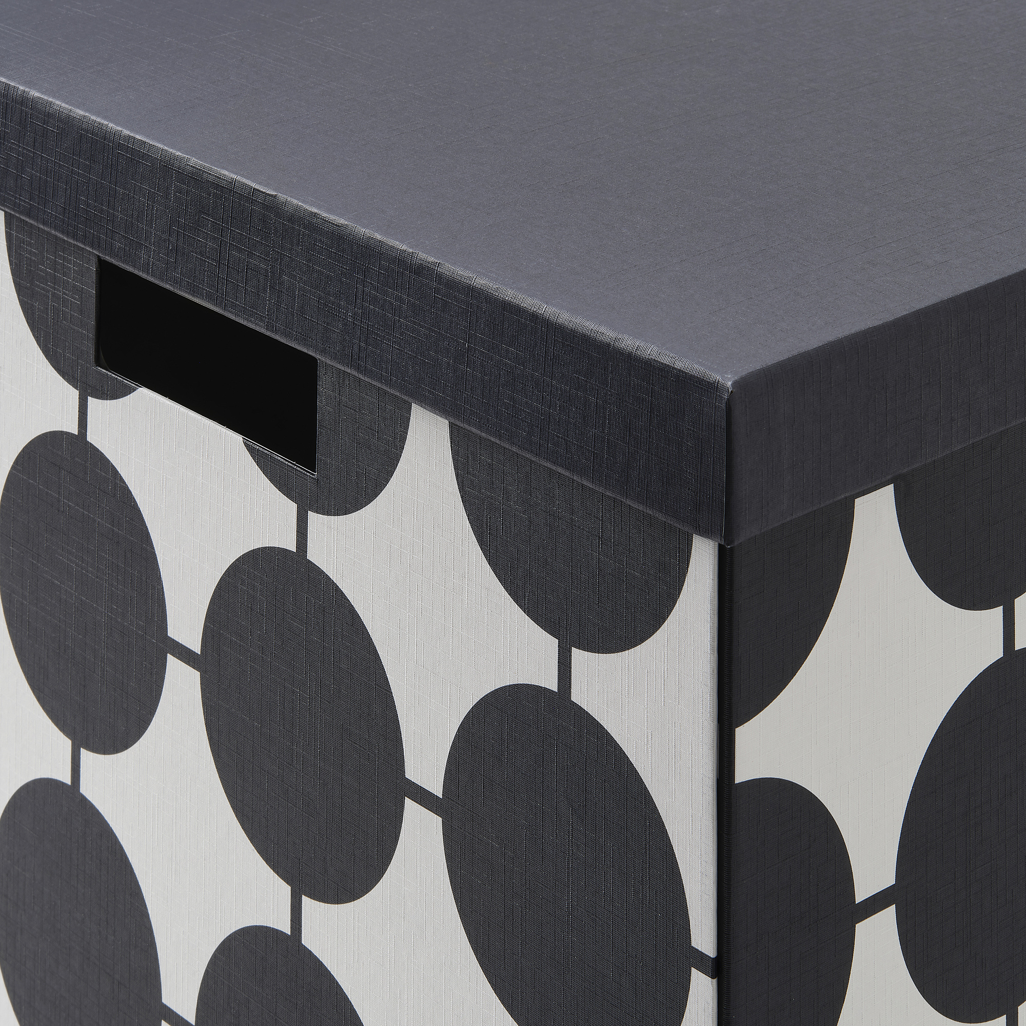 Kotak penyimpanan praktis ini terbuat dari kertas karton yang kokoh, daur ulang, dan memiliki permukaan kertas dekoratif dengan pola grafis.