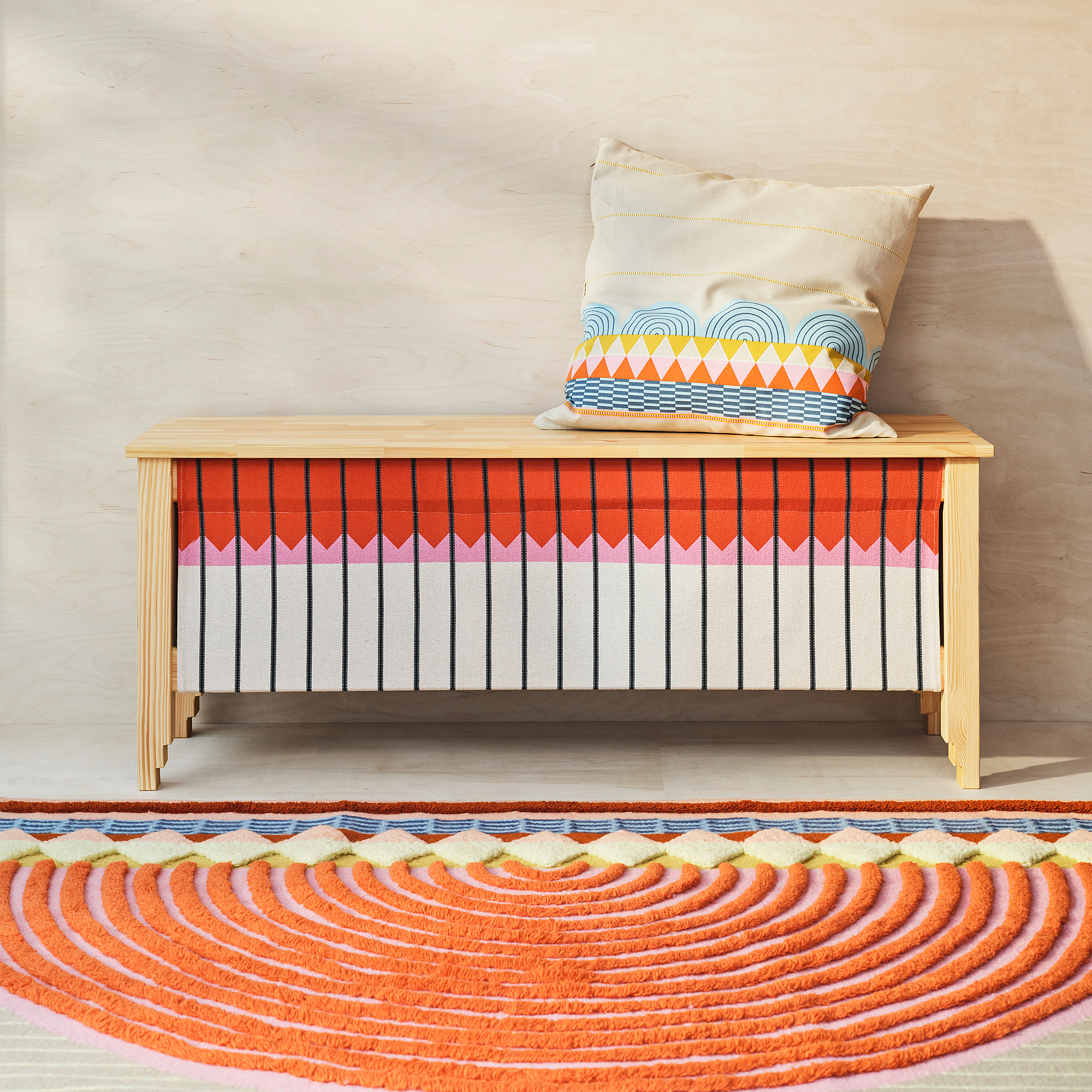 Pesona nuansa tradisional. Bangku dengan tutup dan tenunan tekstil ini memiliki banyak ruang penyimpanan. Bagian dari koleksi OMMJÄNGE di mana seni rakyat Swedia diberi bentuk modern yang menambahkan sentuhan unik pada dekorasi Anda.