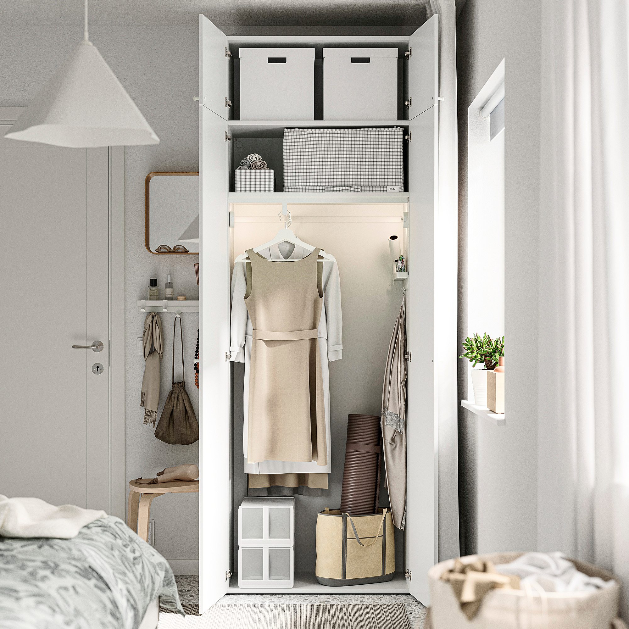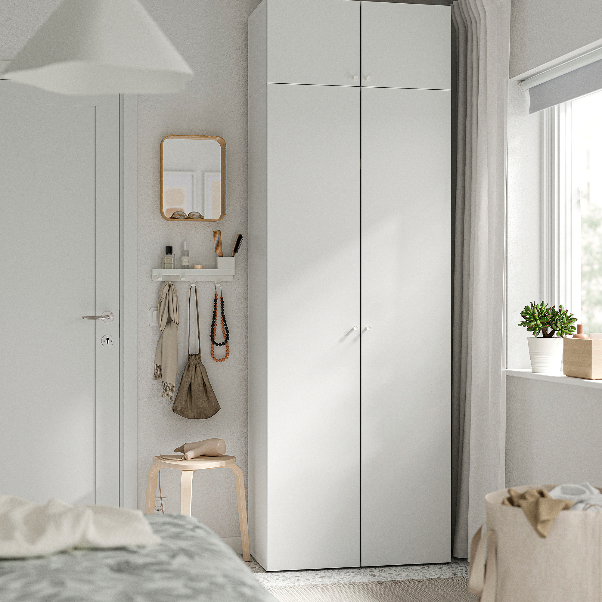 Kombinasi lemari pakaian LASTARE memanfaatkan tinggi dinding untuk menampung pakaian, linen, dan barang lainnya.