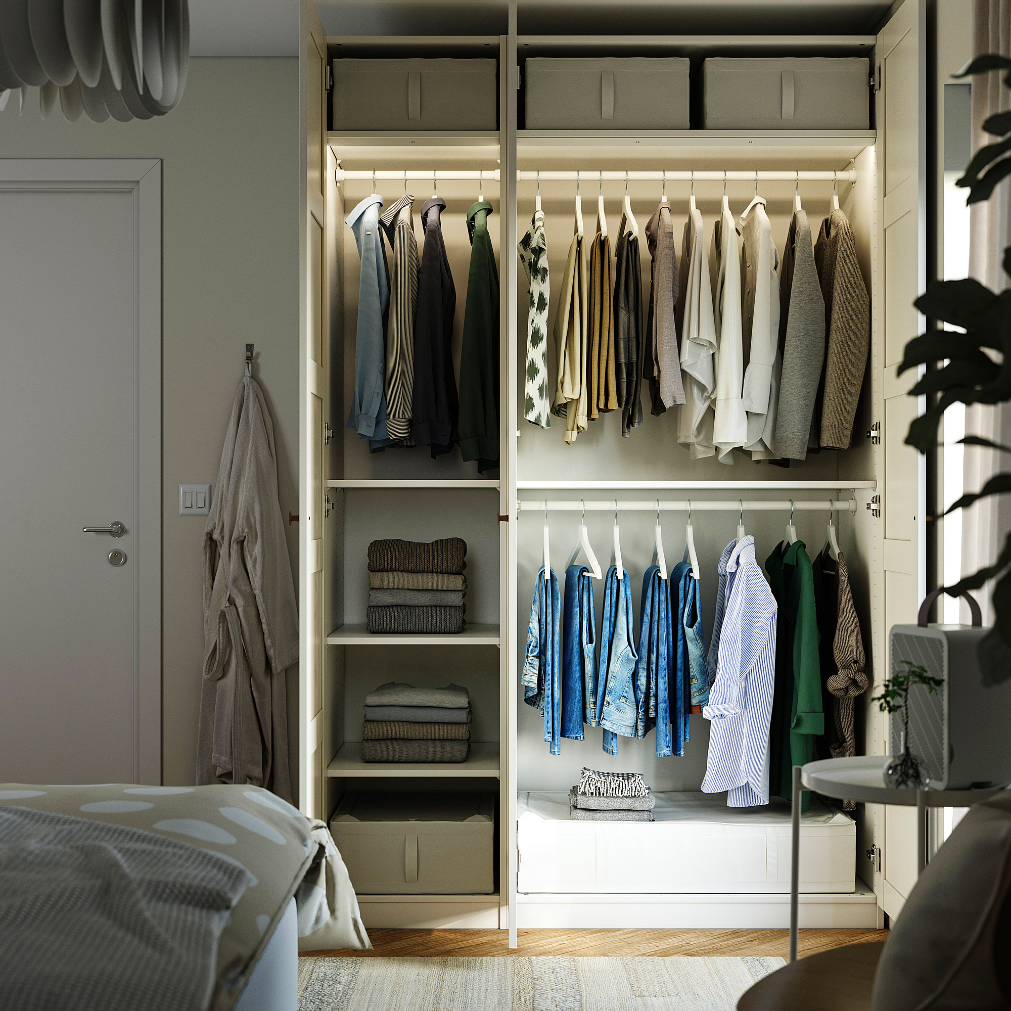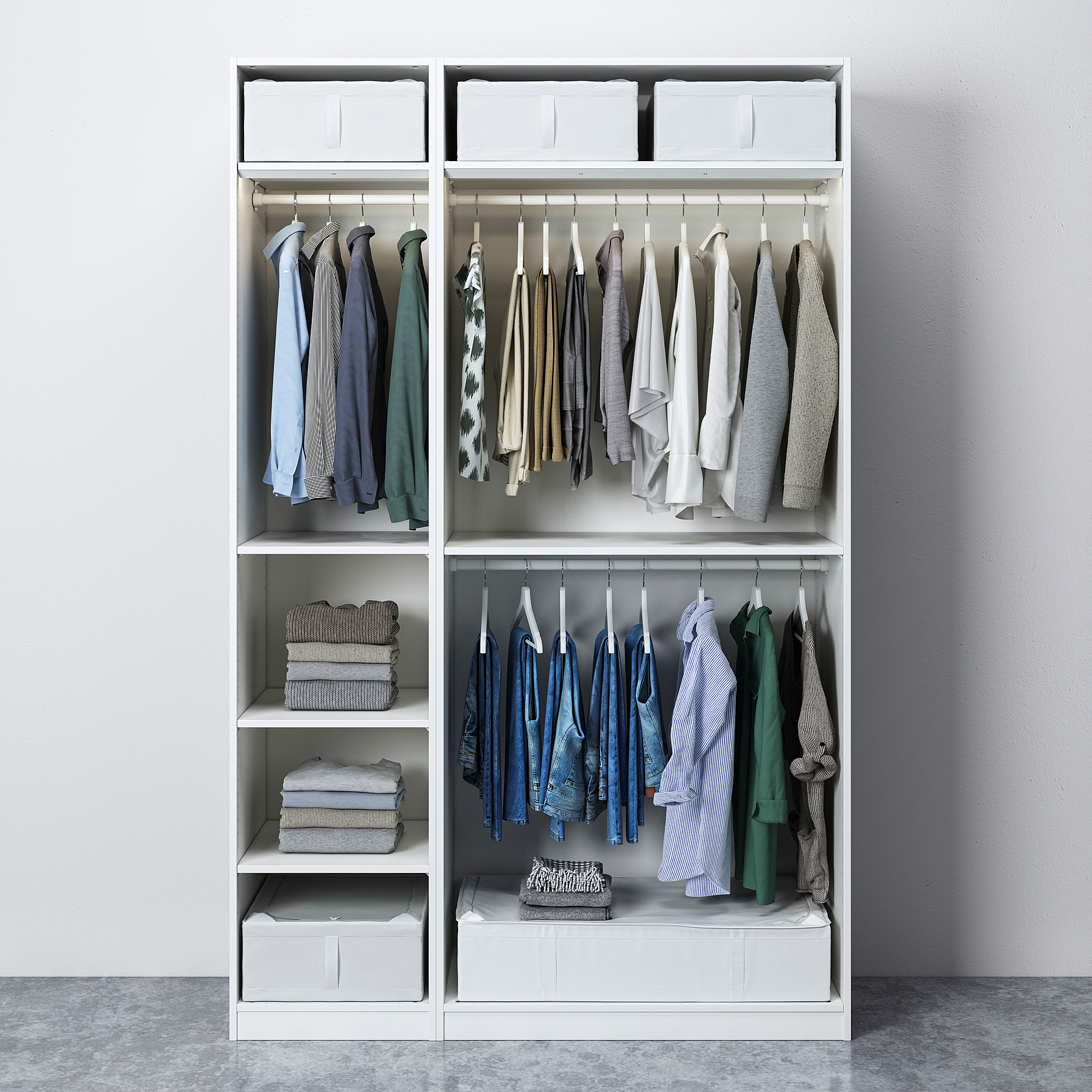 Buka solusi ini di perencana PAX untuk mengubahnya agar sesuai dengan kebutuhan Anda. Laci lain? Lebih sedikit? Tambahkan rangka atau ganti pintu? Tidak ada masalah.