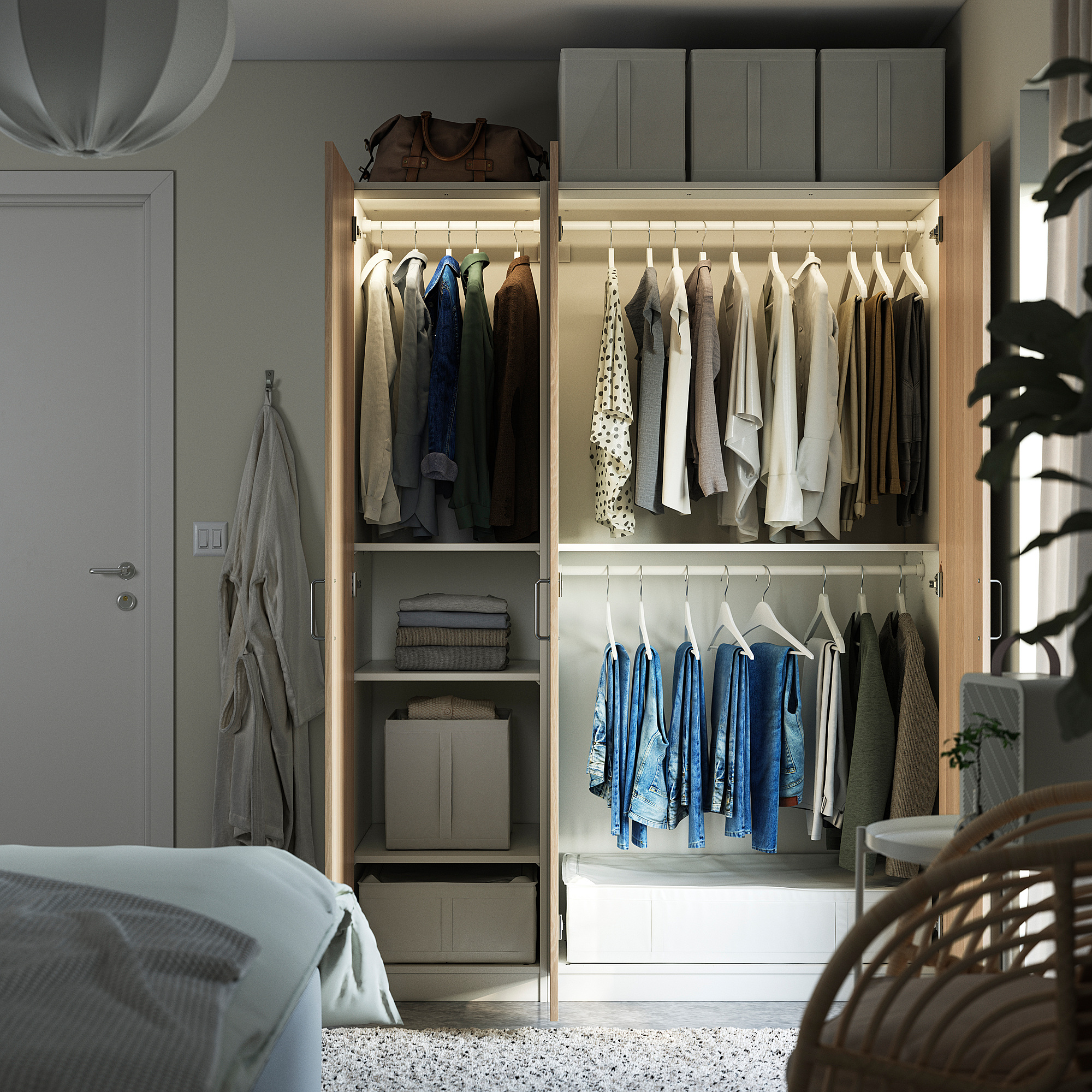 Buka solusi ini di perencana PAX untuk mengubahnya agar sesuai dengan kebutuhan Anda. Laci lain? Lebih sedikit? Tambahkan rangka atau ganti pintu? Tidak ada masalah.
