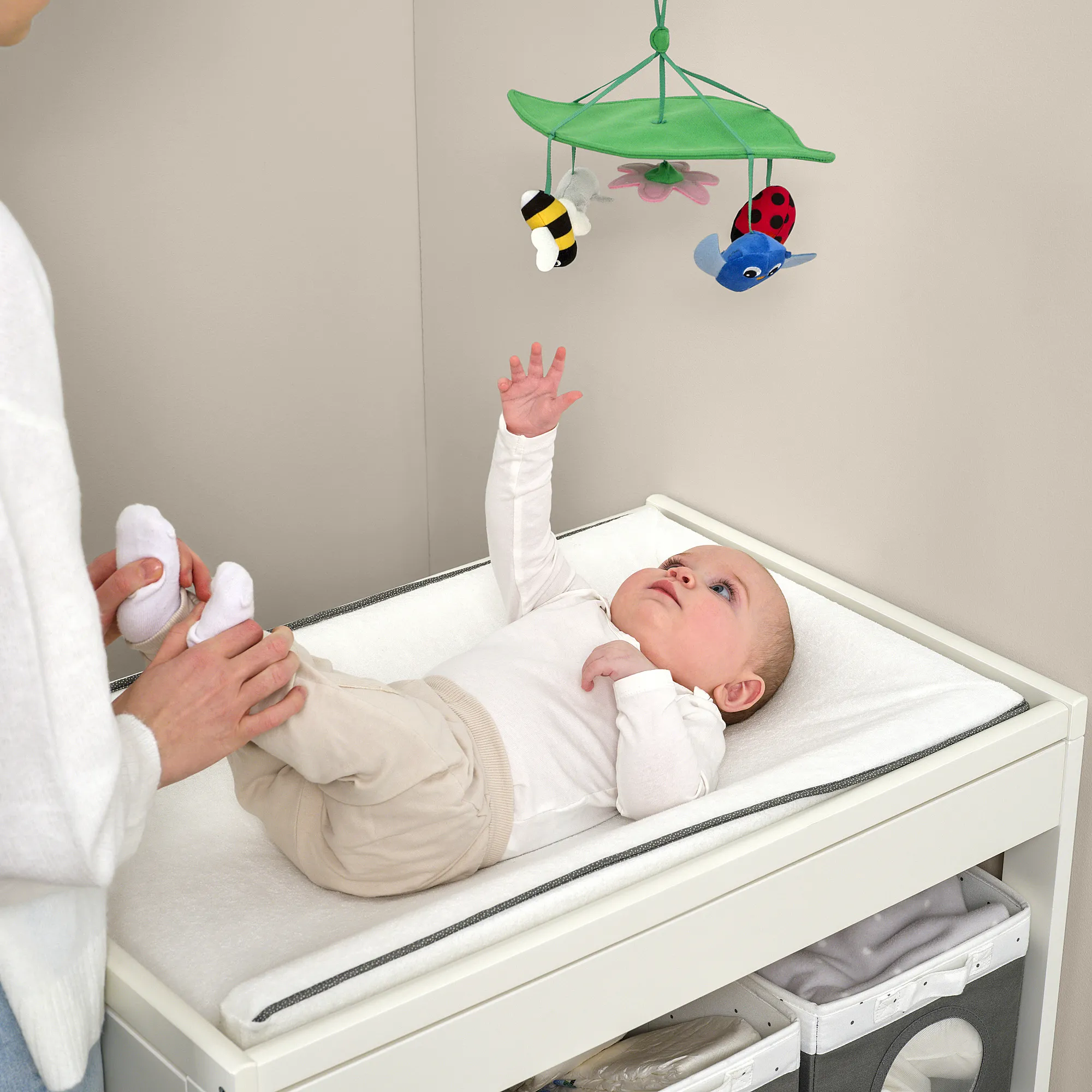 Burung hantu yang ramah, kepik warna-warni, lebah yang penasaran, dan tikus yang menari-nari di atas meja ganti. Gerakan lembut dan warna-warna cerah menarik perhatian bayi Anda, merangsang penglihatan dan rasa ingin tahu.
