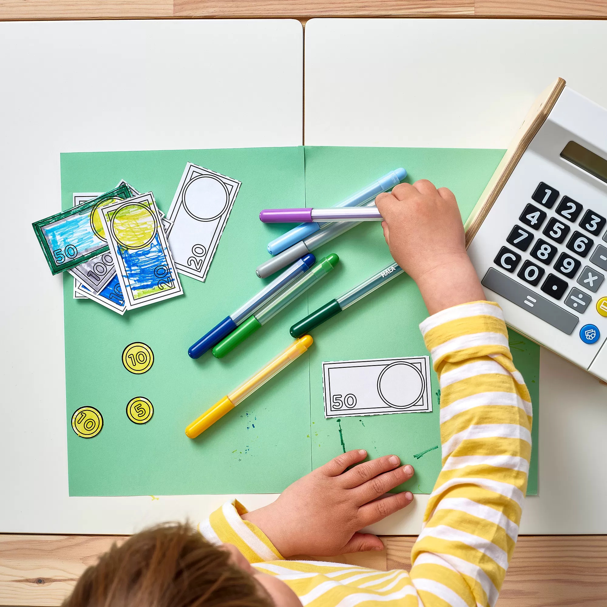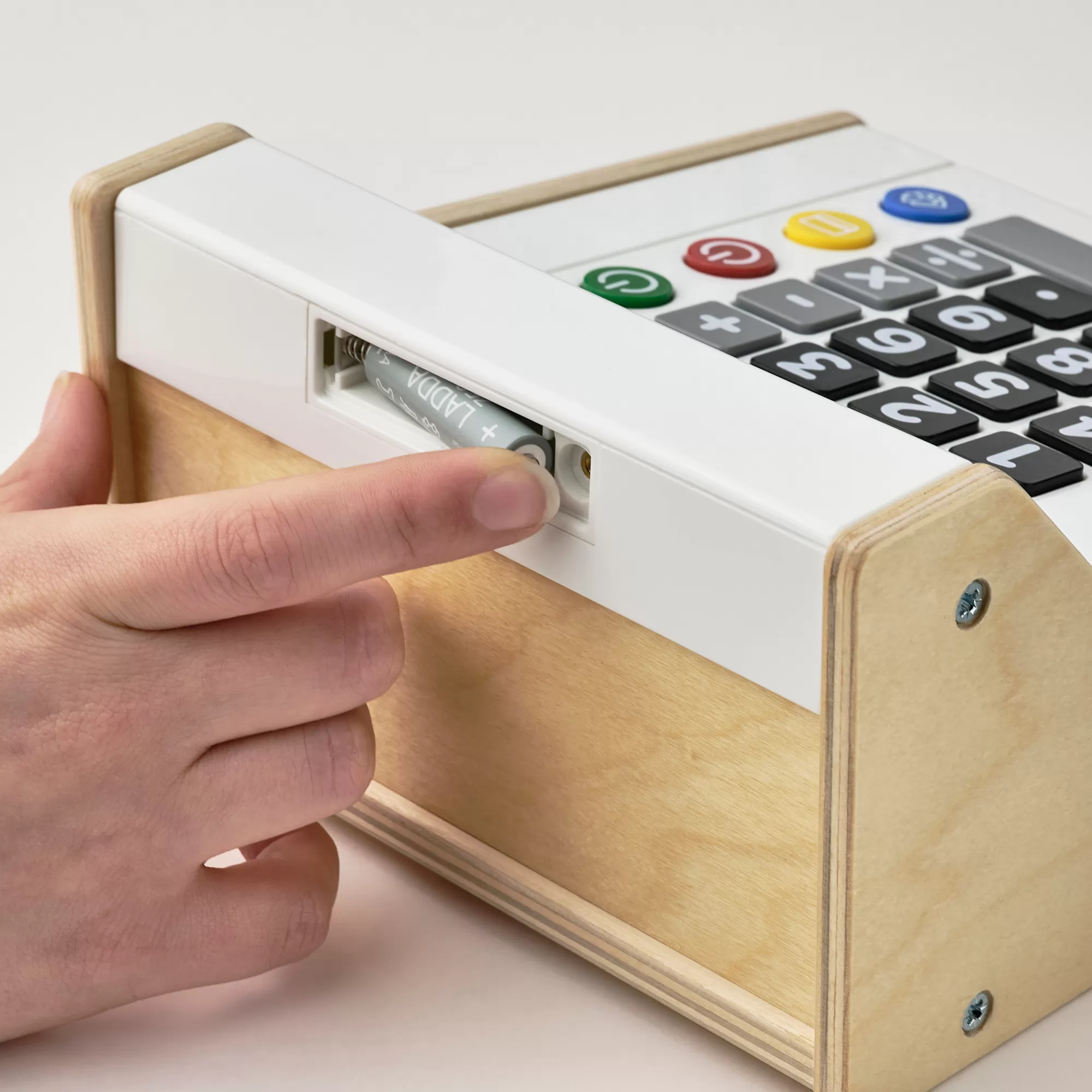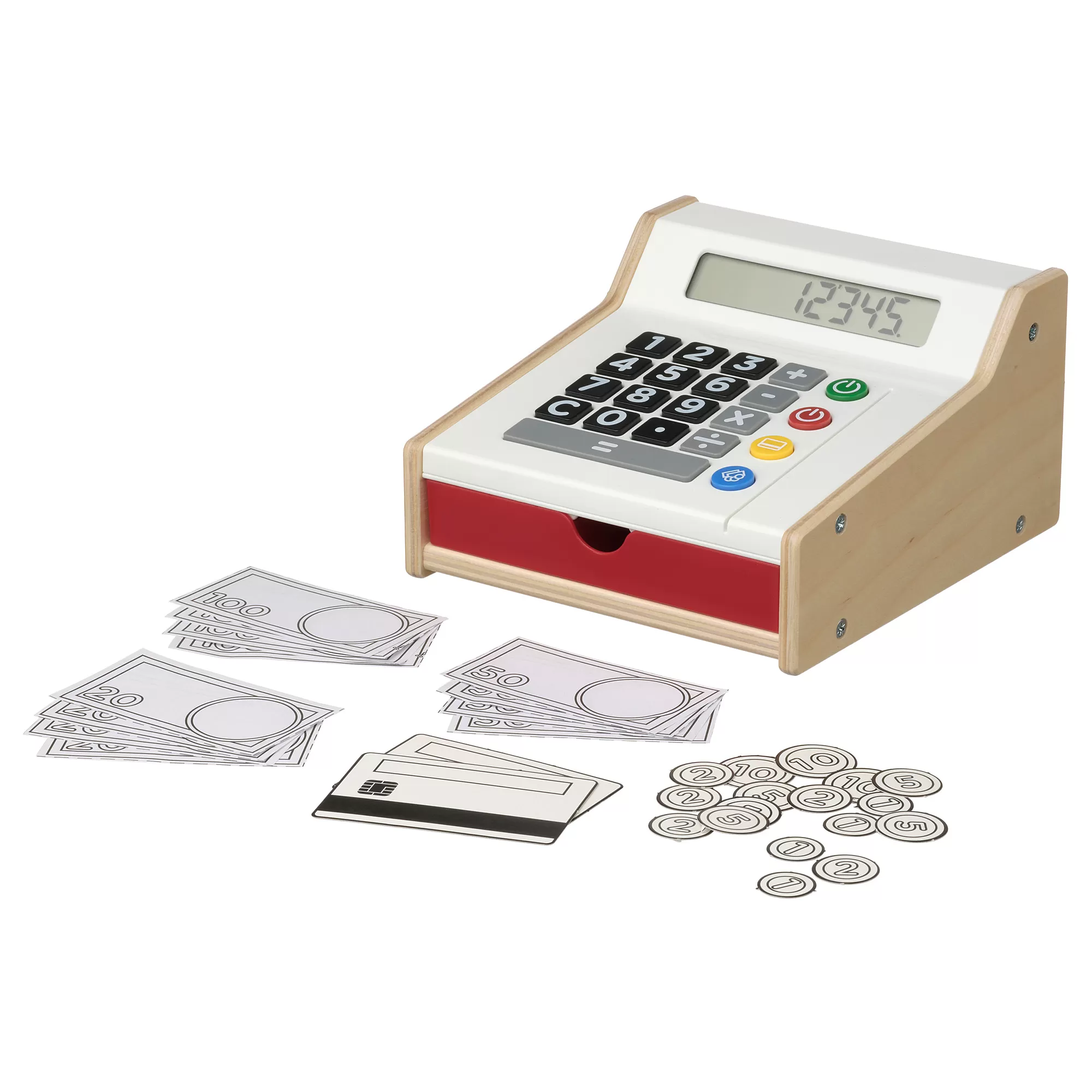Sebuah apel, boneka beruang, dan segelas jus. Totalnya 12 krona Swedia, terima kasih. Bermain menjaga toko menyenangkan sekaligus mengedukasi, terutama saat anak Anda bisa menggunakan mesin kas yang bisa menghitung.