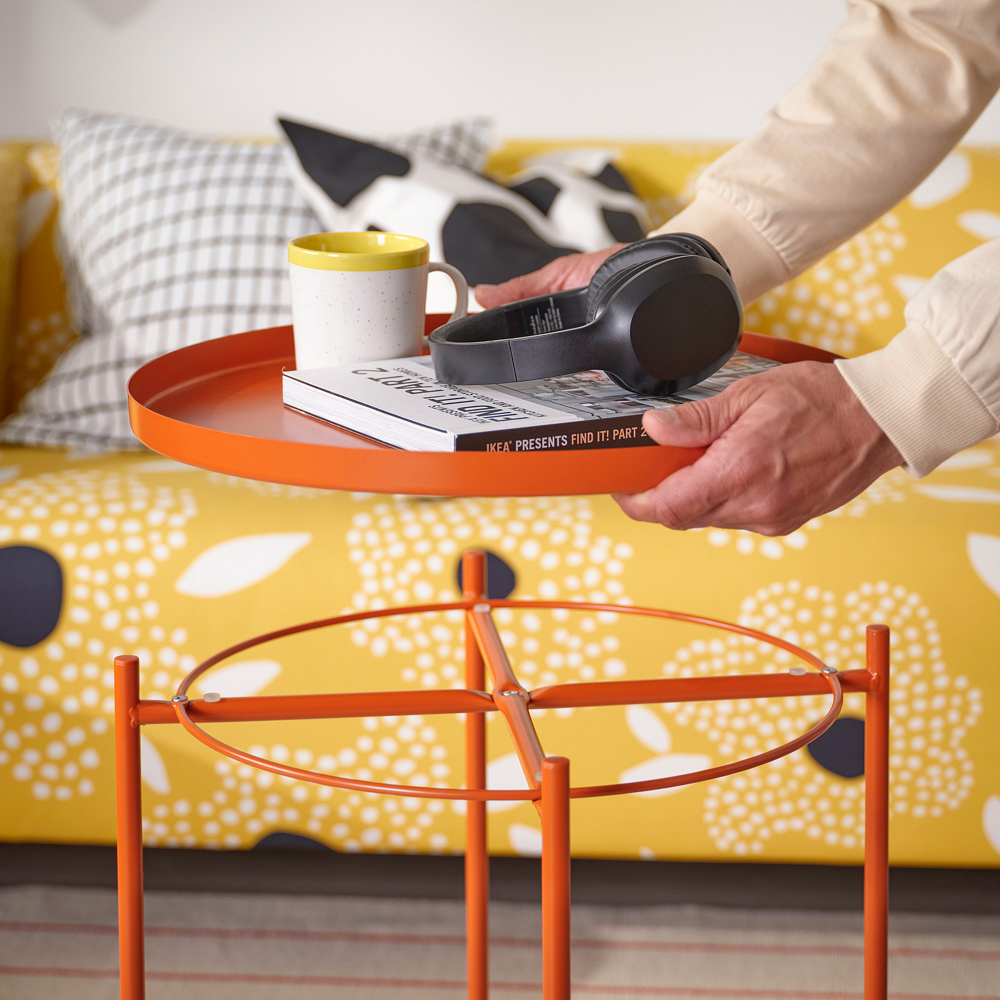 Anda dapat mengangkat dan memindahkan meja keseluruhan dengan mudah, misalnya dari sofa menuju kursi baca.