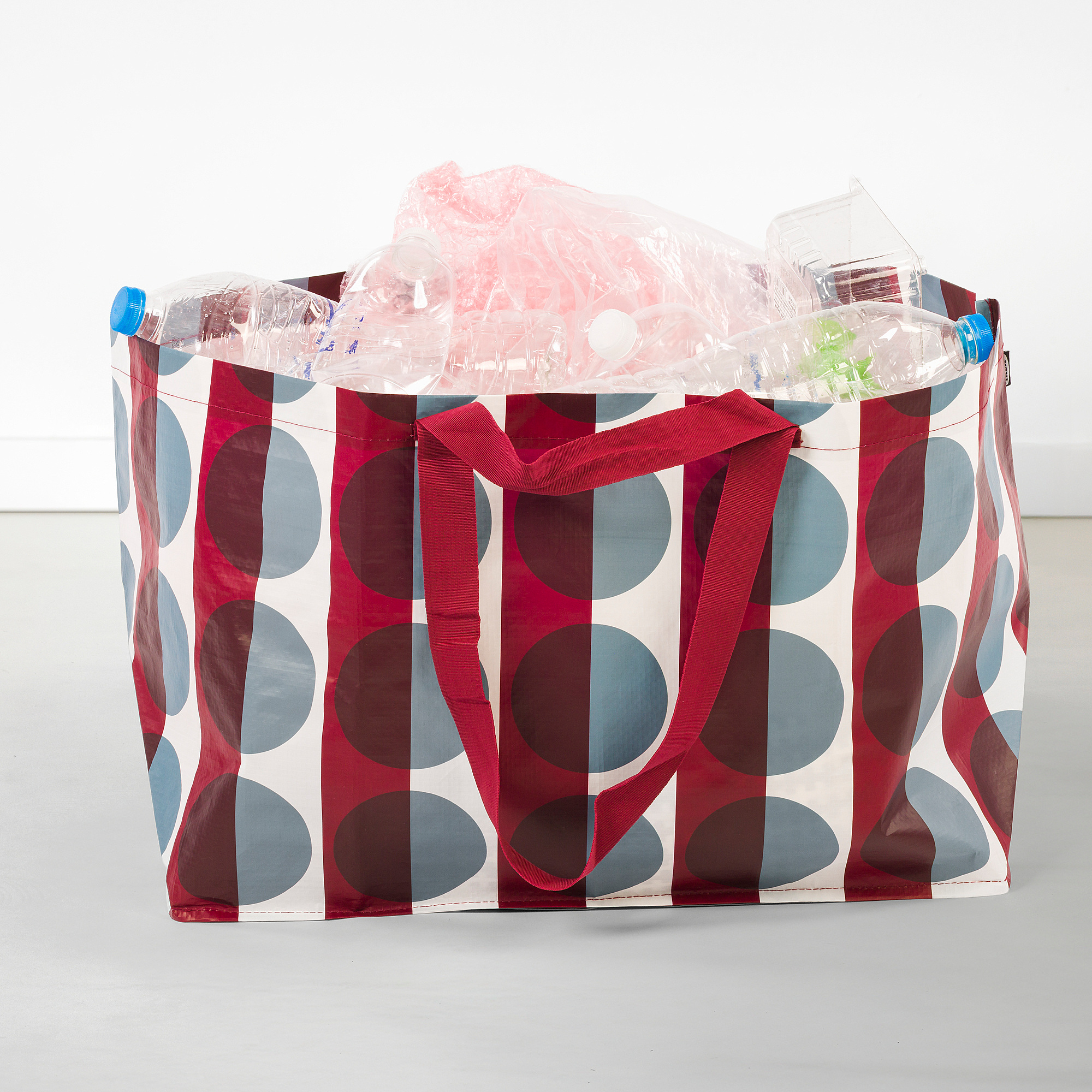Tas besar ini memiliki pola merah, biru, dan putih yang menyatu dengan indah. Dengan tali pendek dan panjang, mudah dibawa di tangan atau di bahu. Praktis, tahan lama, dapat digunakan kembali—dan sangat menarik, atau GÖRSNYGG seperti bahasa di Swedia.