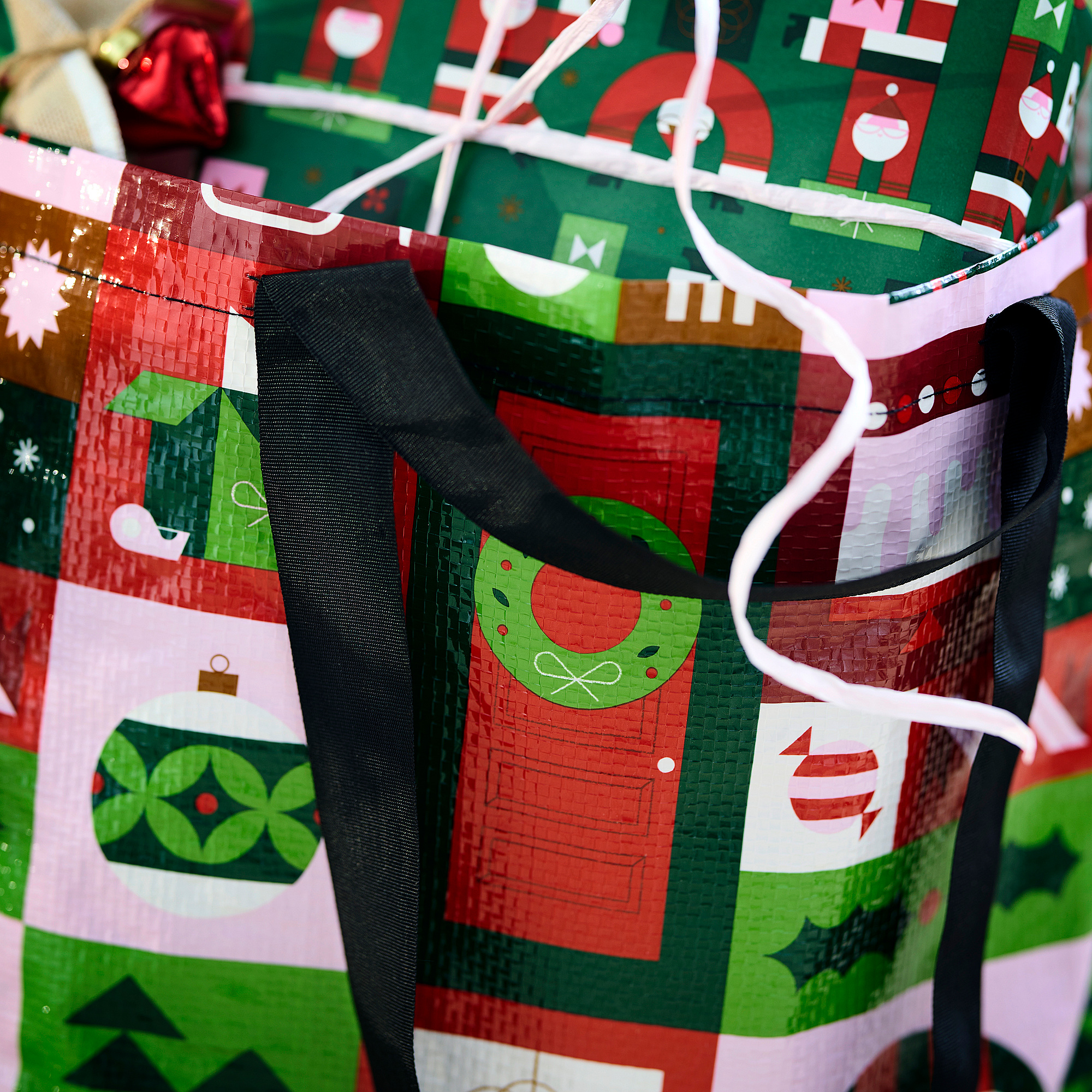 Sama luas dan tahan lama seperti sepupunya yang berwarna biru, tas Natal bermotif ini akan mengikuti Anda ke mana pun Anda pergi. Cocok untuk hadiah Natal, belanja bahan makanan atau perjalanan liburan.