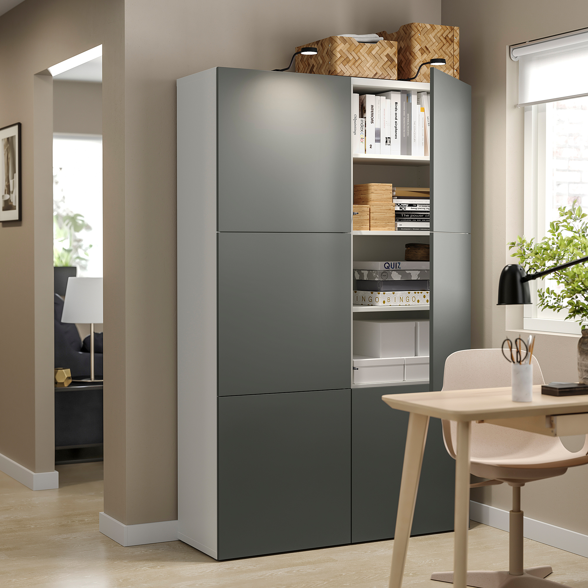 Semua yang Anda butuhkan untuk menyimpan dan mengatur barang di rumah. Ini adalah salah satu dari sekian banyak kombinasi yang memungkinkan. Pilih yang sudah jadi atau buat sendiri dengan alat perencanaan BESTÅ.