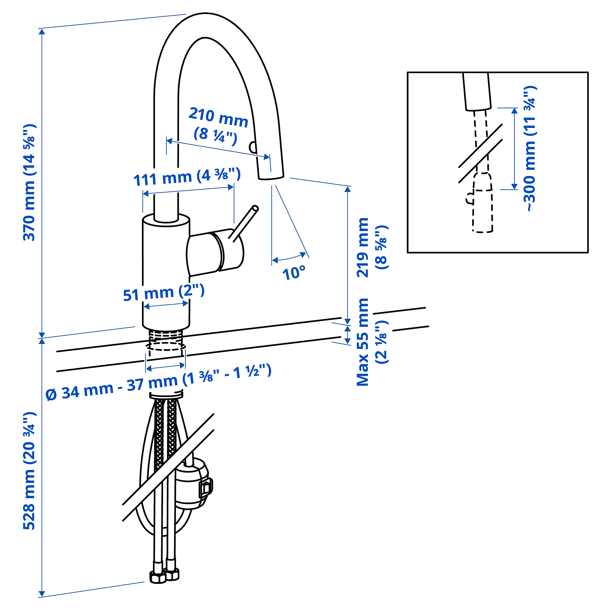 Pencabutan selang cerat yang halus dan cepat berkat pemberat yang dapat dipasang di bawah wastafel/meja.