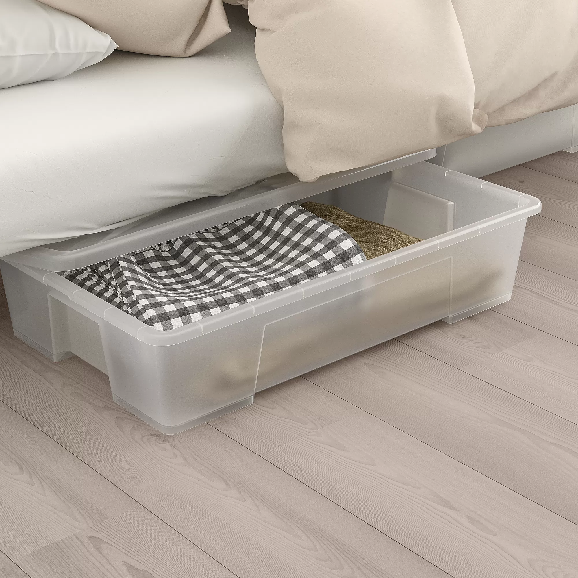 Ruang di bawah sofa didesain agar kotak penyimpanan untuk seprai muat masuk ke dalamnya.