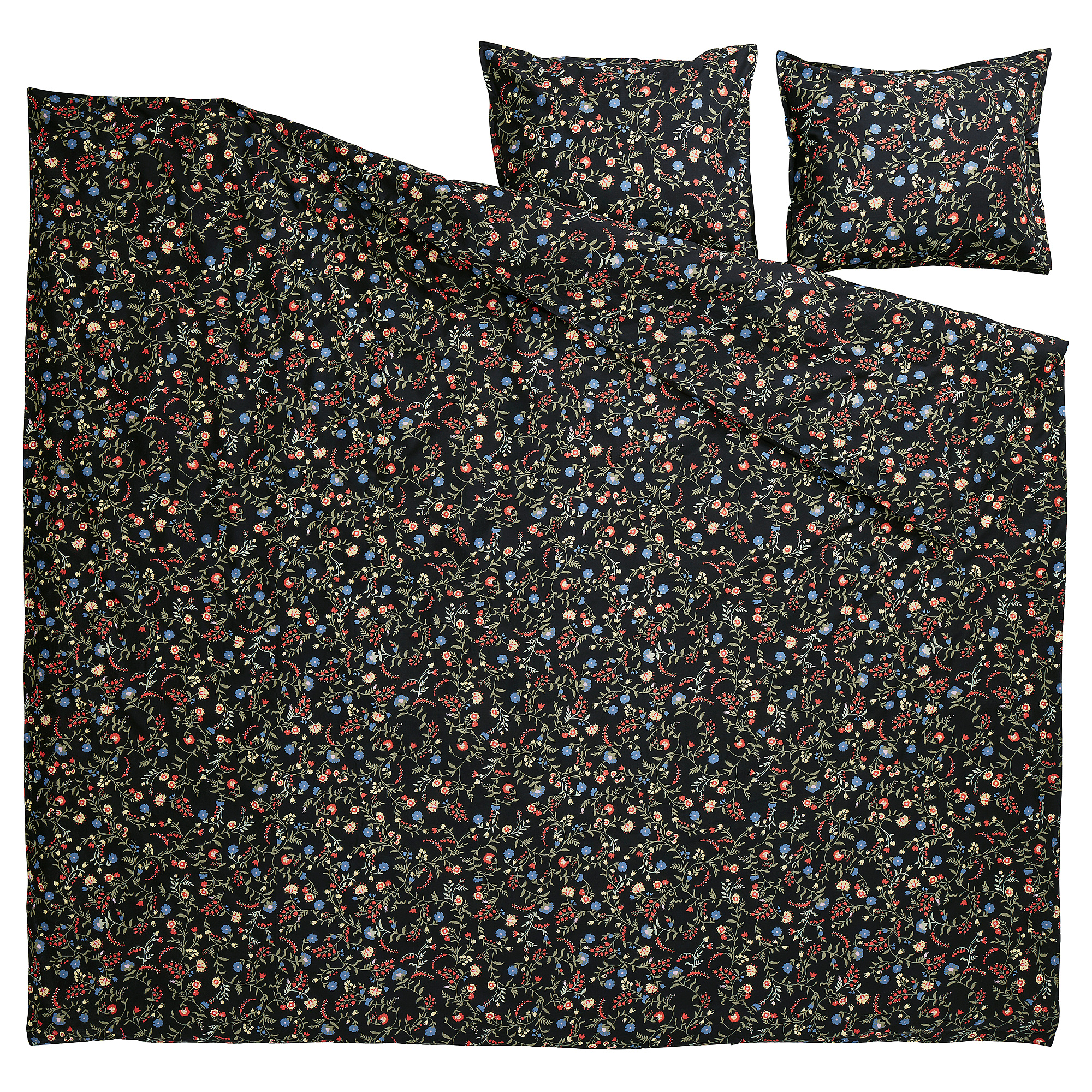 Sarung duvet dan 2 sarung bantal, hitam aneka warna/motif bunga, 240x220/50x80 cm