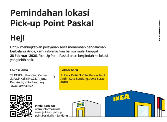 Bandung, 23 Februari 2026 – IKEA Indonesia mengumumkan relokasi Pick-up Point (PUP) Pasar Kaliki yang berlaku mulai 28 Februari 2026. Langkah ini dilakukan sebagai bagian dari upaya berkelanjutan IKEA untuk meningkatkan kualitas layanan serta memberikan pengalaman berbelanja yang lebih baik bagi pelanggan di Bandung.